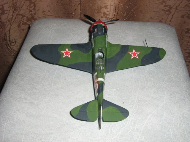 Про мат часть уже было сказано. А Ла-5ФН никогда не красились в черно-зеленый камуфляж. Краски лучше всего "Акан" водные. Есть набор Авиация СССР 1943-1945гг. Идеальный вариант, и не только для начинающих. Стойки шасси стальные. Красил кистью? Красочка легла неровно, и тонировочки бы надо добавить.