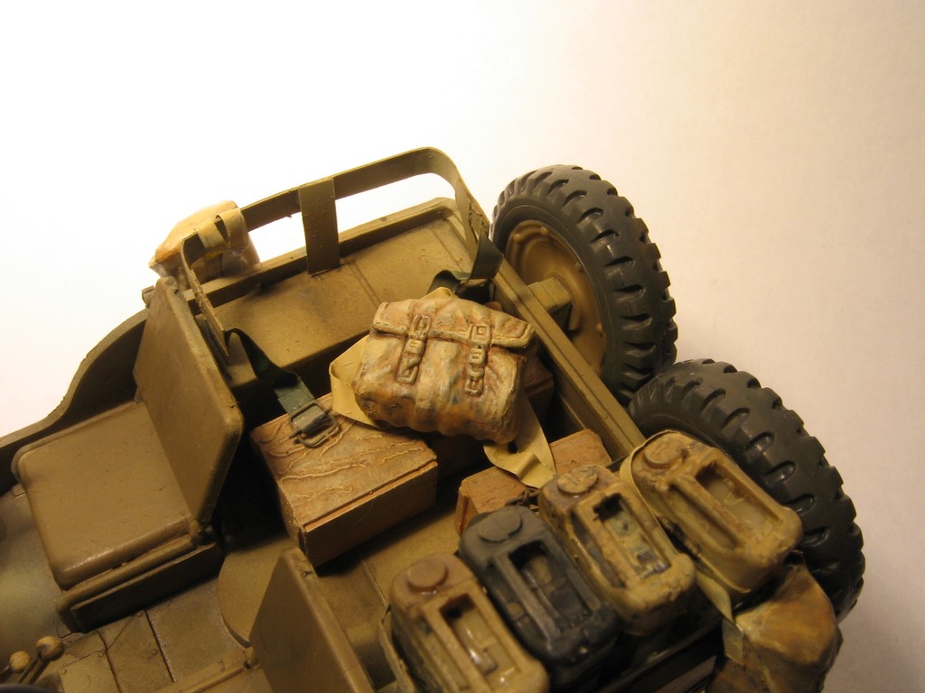 Что-то очень круто решётка на морде выломана..(хотя есть фото именно такое).и ручки канистр с 2 поперечинами? Халтура у ТАМИИ вышла. У меня есть набор канистр,там три,как и у немцев,сомневаюсь в этом. Да и оригинальные фото говорят об обратном.