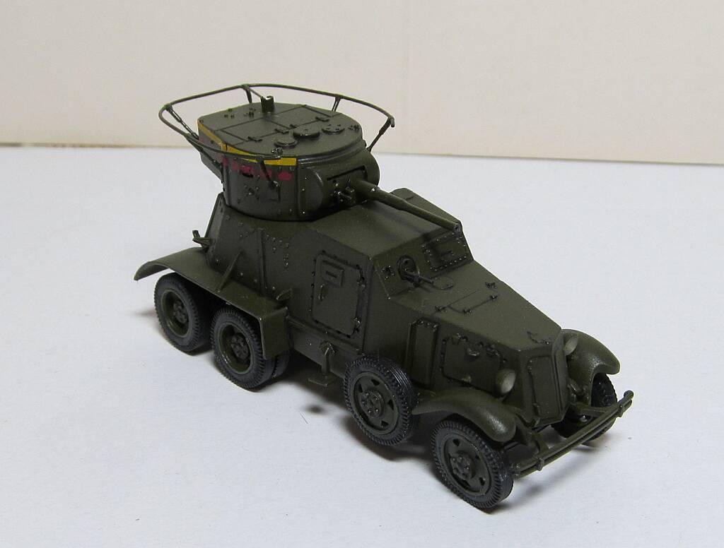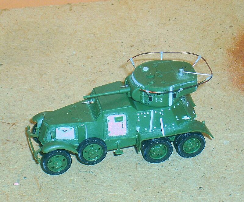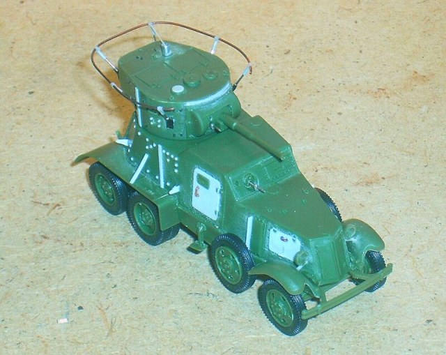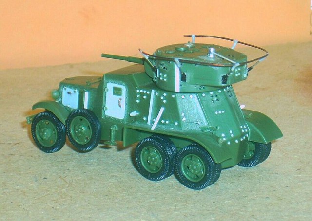 Захотелось мне, отчего-то, построить такой броневичок. Тема не моя, поэтому в подробности матчасти особо не вдавался, только заклёпок на корпусе и башне прибавил, фары высверлил да поручневую антенну смастерил. Красил водорастворимым "Аканом", кистью. Потом попытался изобразить тонировку, не особенно получилось, видимо художественного вкуса и терпения не хватает.