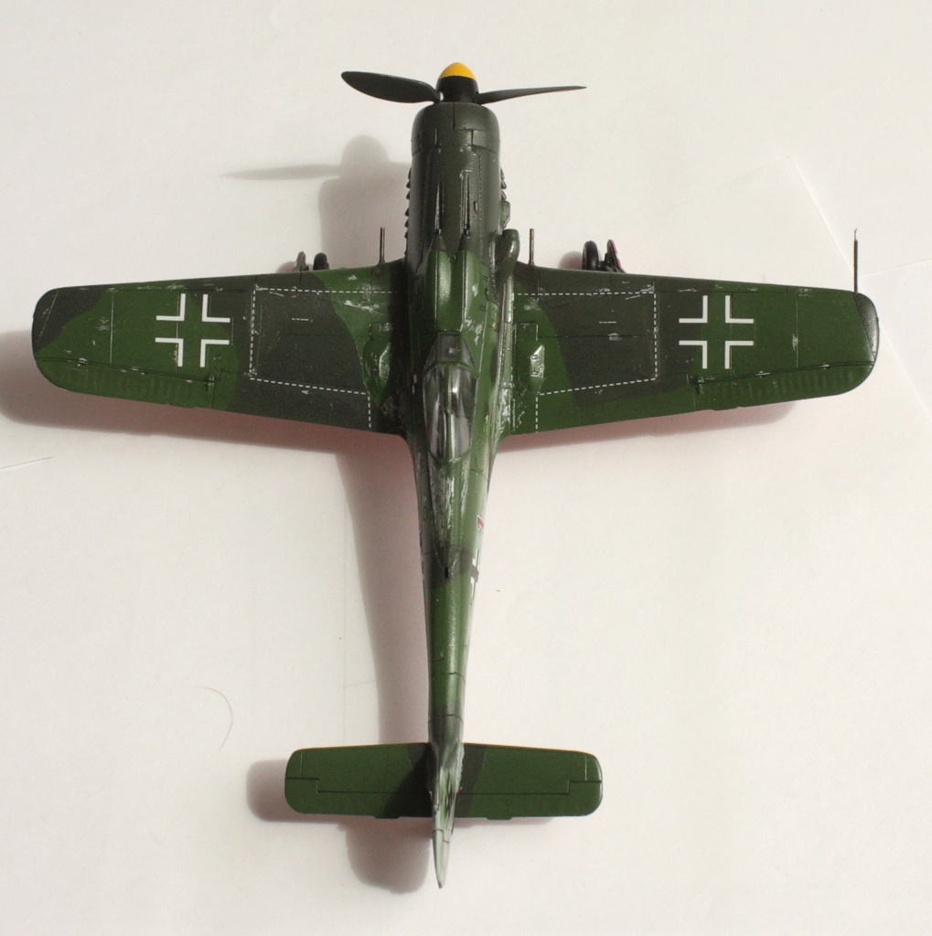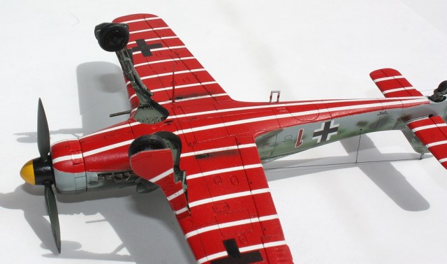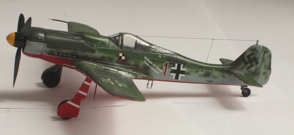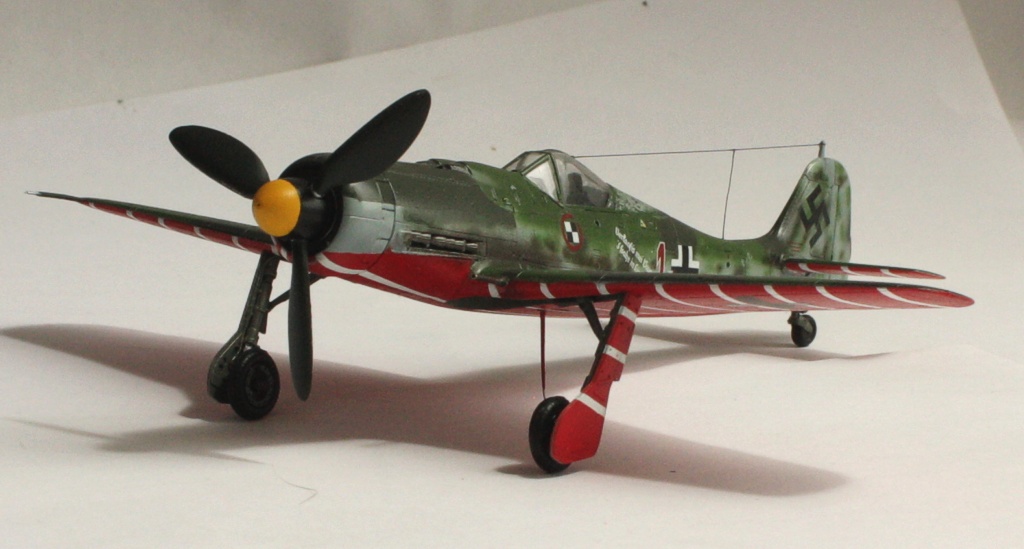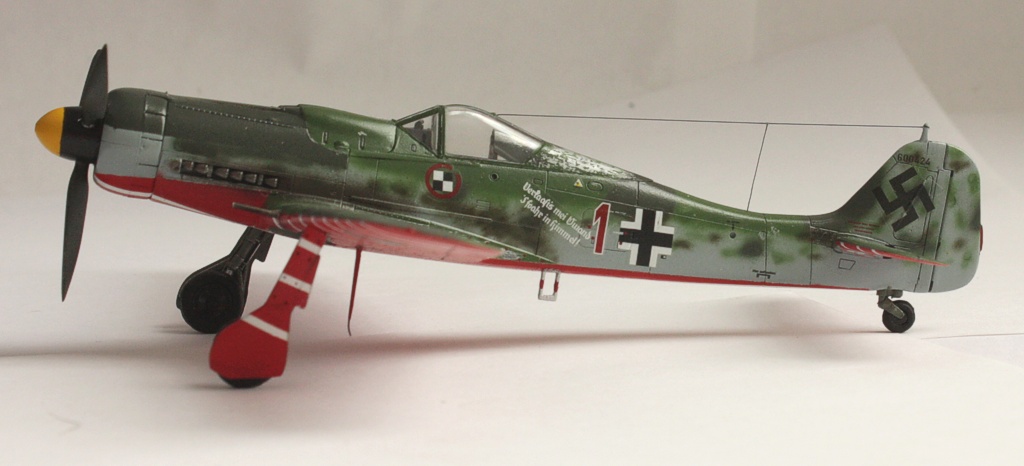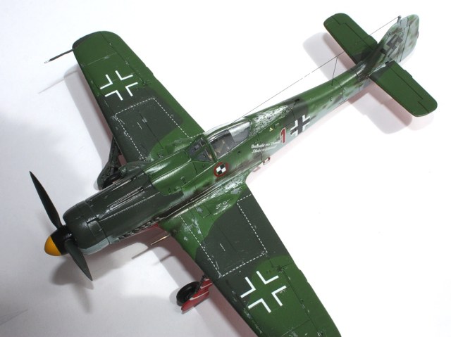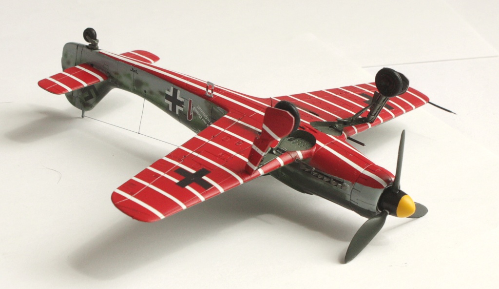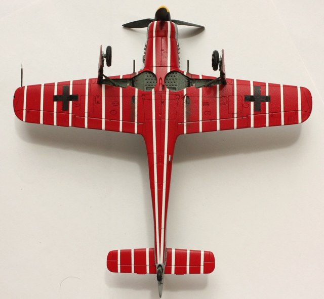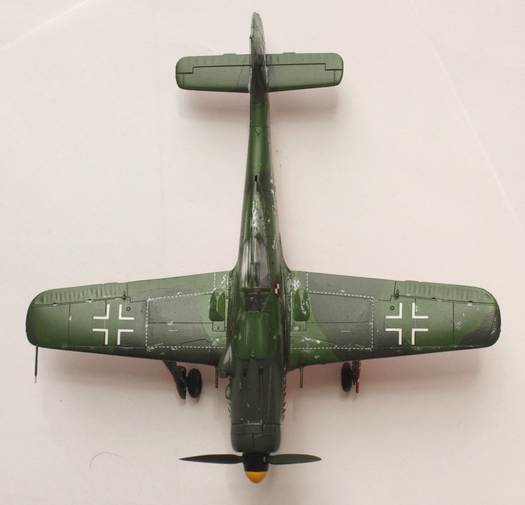 В вашей модели бомба совершенно лишняя - на этих машинах даже пилонов для подвески бака или бомбы не было, ведь они использовались только как чистые истребители в зоне своего аэродрома. Внешних пушек у этих машин не было, только синхронные в корне крыла. На створках шасси должны быть белые полосы, они шли по всей хорде крыла, не прерываясь. Винт зря обдирали "до металла" - он был деревянный. Кок - желтый и черный. Пятна надо было сделать хотя-бы кисточкой, немецкий камуфляж характерен именно ими.