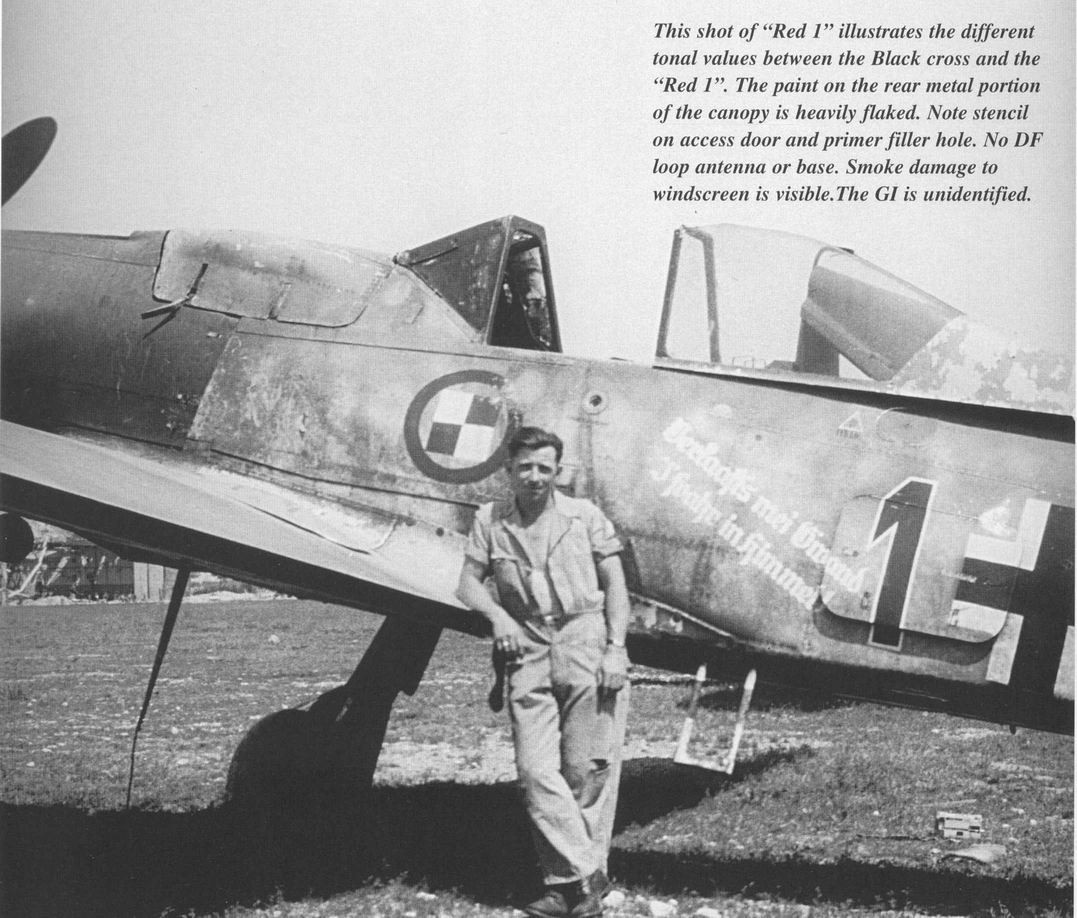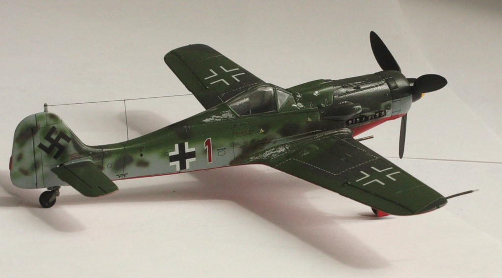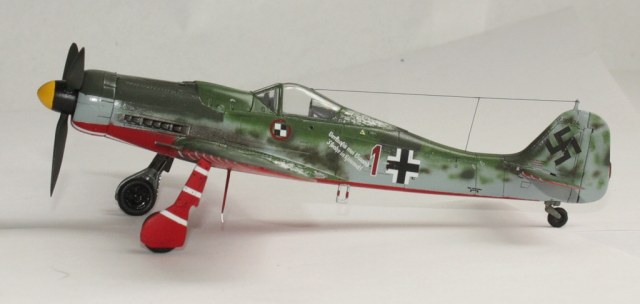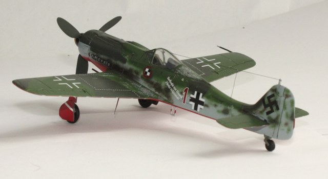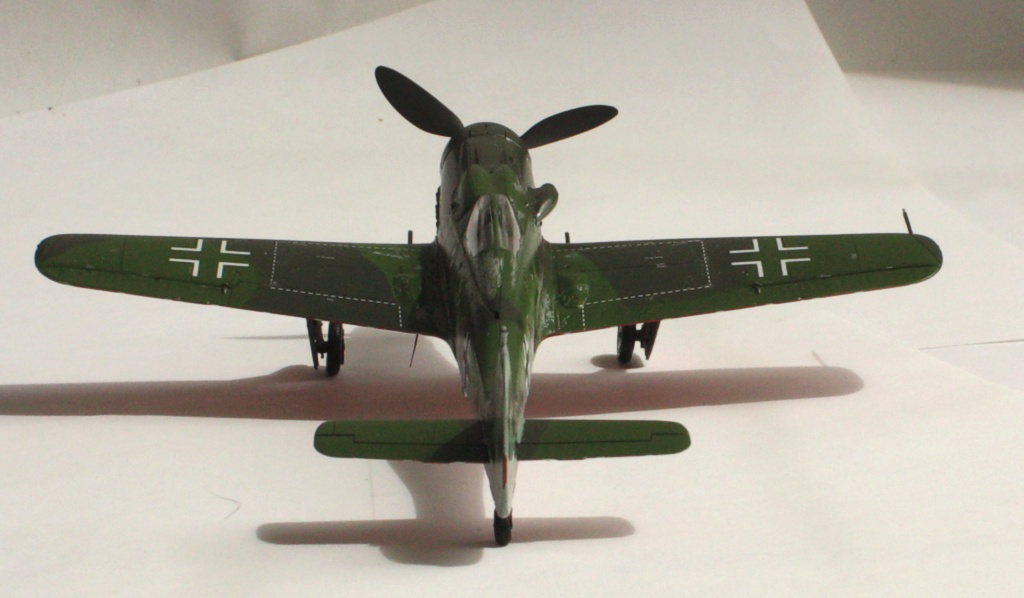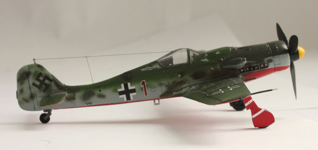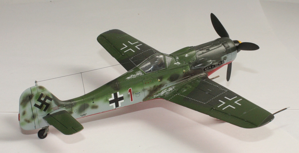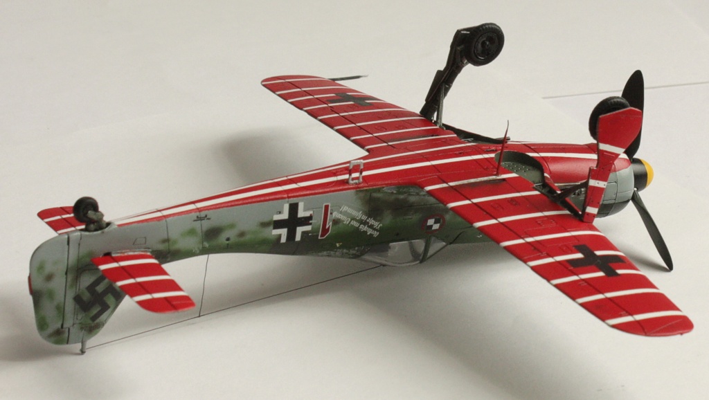 В вашей модели бомба совершенно лишняя - на этих машинах даже пилонов для подвески бака или бомбы не было, ведь они использовались только как чистые истребители в зоне своего аэродрома. Внешних пушек у этих машин не было, только синхронные в корне крыла. На створках шасси должны быть белые полосы, они шли по всей хорде крыла, не прерываясь. Винт зря обдирали "до металла" - он был деревянный. Кок - желтый и черный. Пятна надо было сделать хотя-бы кисточкой, немецкий камуфляж характерен именно ими.