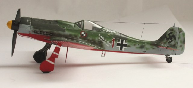 FW-190D-9 из Jagdverband 44, сформированной в феврале 1945 года для прикрытия взлетающих и садящихся Ме-262, сильно уязвимых на этих режимах. Союзники к этому времени устроили настоящий террор над аэродромами Luftwaffe, а 262-ые на взлёте были неуклюжи (так сбили, якобы, самого Вальтера Новотны). Что бы свои зенитчики в суматохе не завалили мечующиеся над аэродромом 190-е, их снизу и разукрасили в красный цвет с белыми полосам, за что JV44 получила название «попугайская эскадрилья».