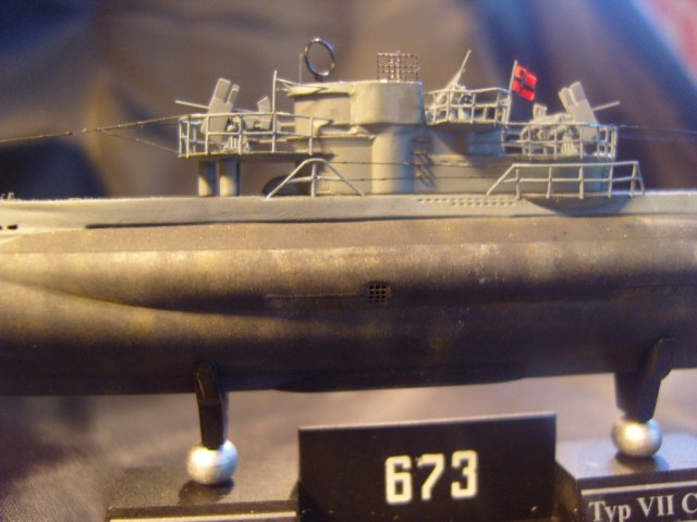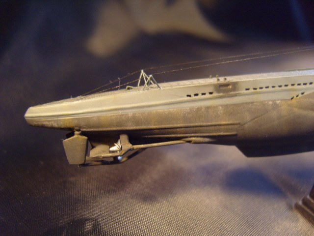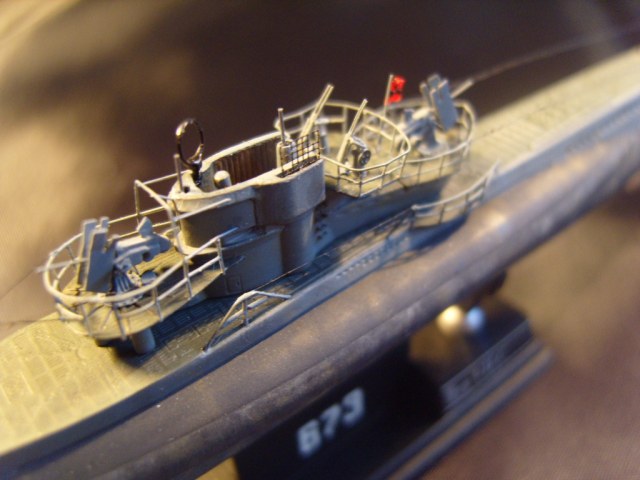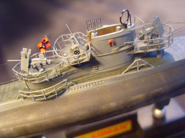 Сборка модели проходила на "автомате". Как и раньше: высверлил шпигаты,заменил палубу на носу и корме на травление (не совсем достоверно, но смотрится прилично), утоньшил лопасти гребных винтов, заменил валы на металл, прошпатлевал утяжины на корме (бонус-опция от Флагман). Изготовил заново все ограждения, зенитные орудия, выстрелы, шпиль, подставку... Из обрезков травления изготовил скобтрапы на ограждение рубки и матрац антенны FuMO 30. Красил сей субмарин Тамией. Тонировал Тамией и МИГом.