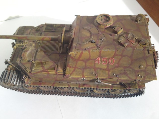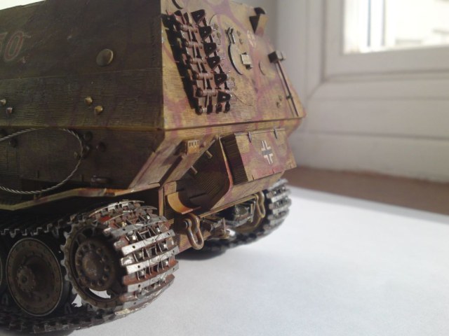 Модель интересная, но соглашусь с вышеперечисленными замечаниями коллег. Добавлю, что в таком варианте циммерит на лобовой части рубки ни на одном "Элефанте" замечен не был. Это ошибка "Драгон". Вам надо было стачивать его полностью либо оставлять треугольники.