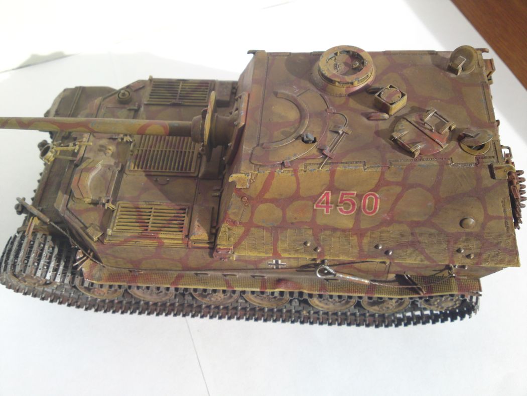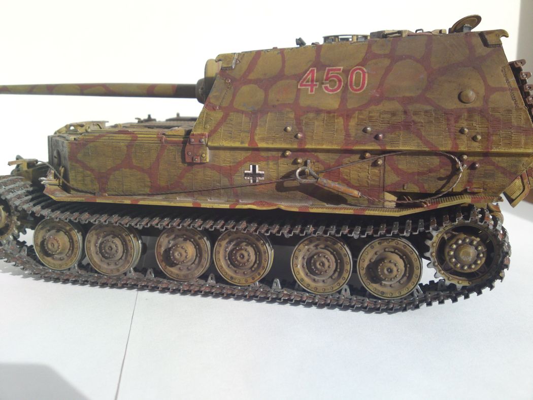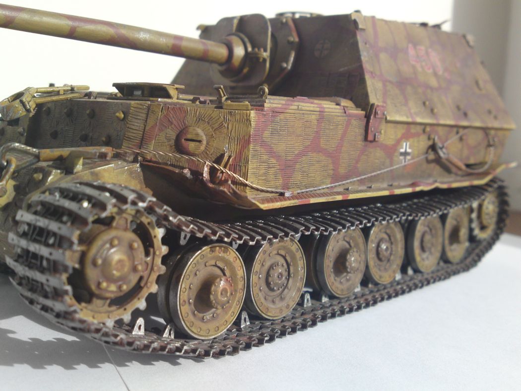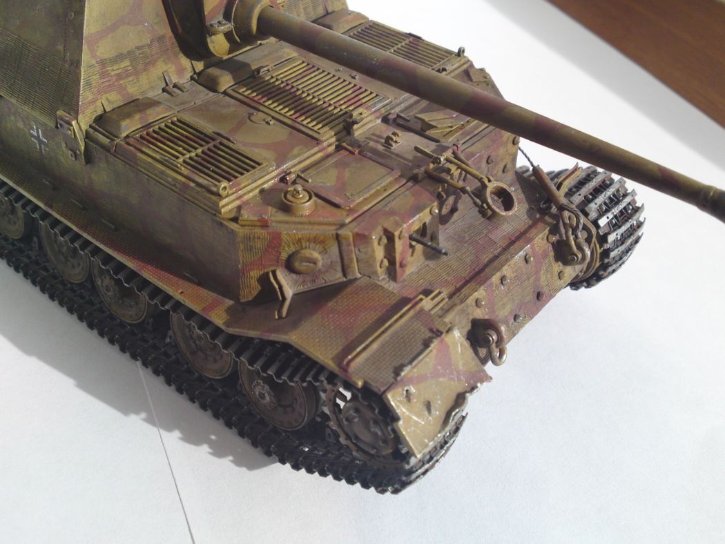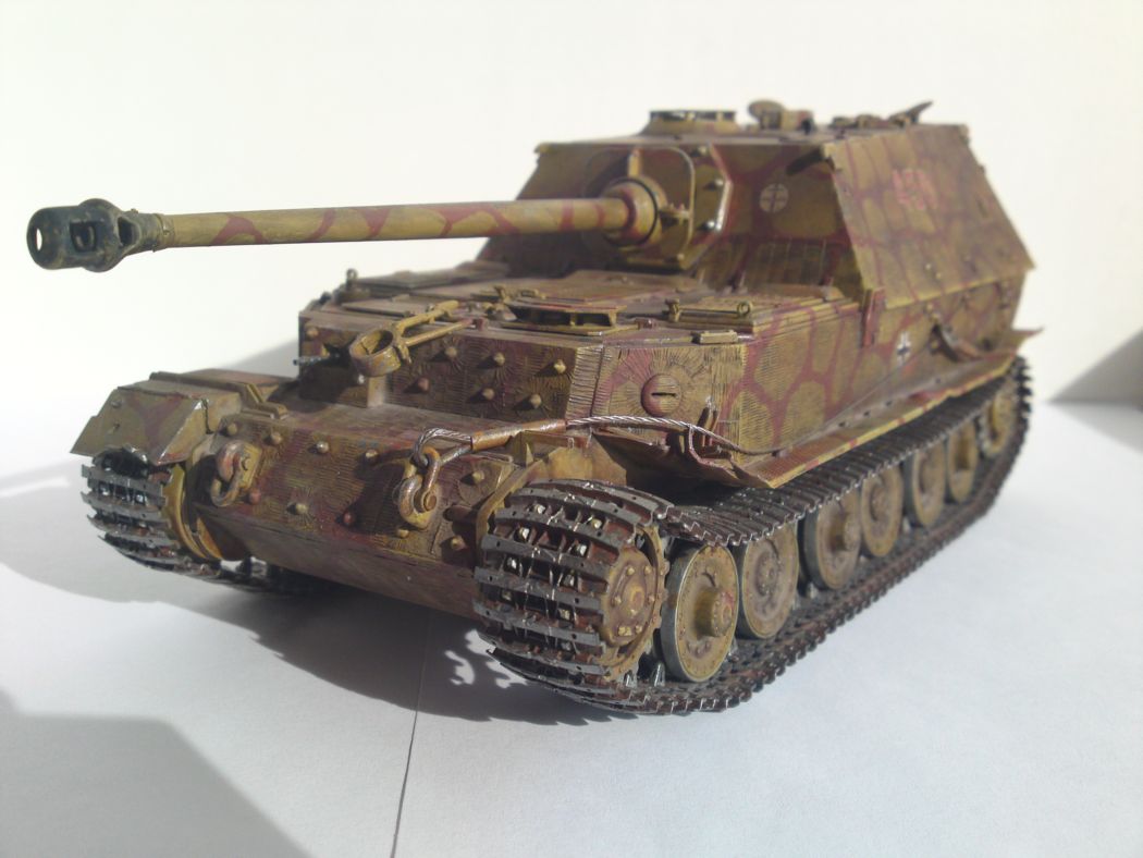 на курской были ферды и по итогам их разгома произошла модернизация в элефант) а почему цвет жёлтый? и просто испачкан это вообще на ваших моделяхз очнь бросается в глаза все модели покрыты каклойто грязью. я так думаю фильтры... но не проще покрасить в правильный цвет и нанести правильный фильтр, фейдинг сколы а уж потом можно грязь и пыль. трос не очень получился смотровые щели на лоб броне заваривались наглухо! а у вас всё открыто
