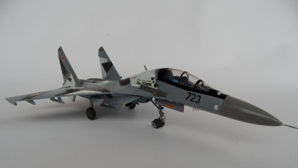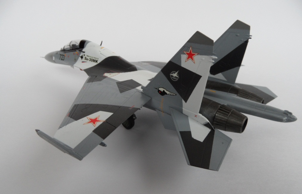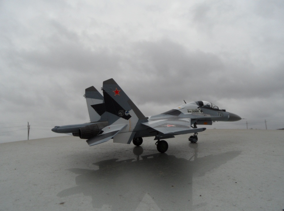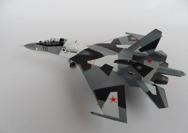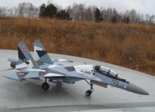Здравствуйте, решил я построить Су-35++++ , последний истребитель серии Су-35 КнААПО, для этого был заказан Су-27 ICM и деки Бегемот, набор пришел - работа закипела, но случилось чп - я потерял фонарь. Можно было конечно и заказать новый, я так и хотел сделать, но в последний момент взгляд упал на шкаф, там пылился Су-30, собранный еще в начале моделирования, решил - а почему не сделать Су-30, не искать хеллер, а сделать самому. От звезды была имплантирована верхняя часть фюзеляжа и фонарь то же самое было удалено у исм , потом была примерка и приклейка . После того как все встало на место шов был зашпаклеван. Носовой конус делал можно сказать с нуля . С самого начала решил, что камо будет по мотивам Су-35, ломаный, который сейчас в моде, и ПАК ФА тоже имеет подобный. В природе такого самолета нет - но у меня будет-решил пофантазировать: к следующему МАКСу решили представить Су-30 МКК в новом камо, а почему нет, да и я потренировался перед Су-35 и ПАК ФА. Из доработок: переднее шасси сделал двойным, вырезал штангу дозаправки, изготовил первую ступень компрессора и проводку на шасси. Грязнить и наносить расшивку, а уж тем более следы эксплуатации не стал - все таки демо-версия, а они уж очень чистые. Вооружение тоже не стал подвешивать. По качеству модели: Исм стыкуется плохо - хуже звезды, но деталировка хороша и расшивка внутрянняя . Ну вроде как все, как я затюнил Су-30 решать вам, жду отзывов.