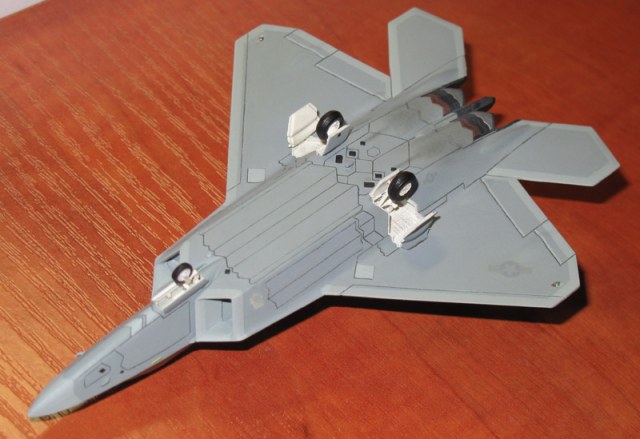 Вторая проблема - боковые крышки люков отсеков вооружения. С открытыми люками, конечно, модель смотрится интереснее, но я с самого начала хотел сделать люки закрытыми – в таком виде F-22 мне больше нравится. Так вот, верхние кромки крышек боковых отсеков образуют углубления, которых не должно быть. Увидел я это уже также после покраски модели основным цветом, когда сравнил модель с фотографиями – на фото углублений небыло. Решил все же, это исправить - замазал густой краской и зашкурил после просушки.