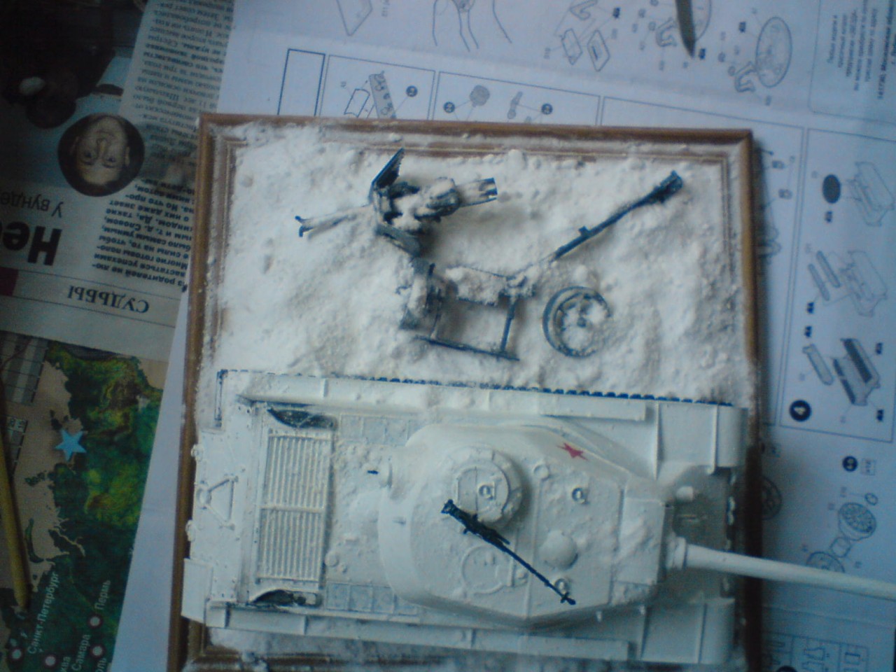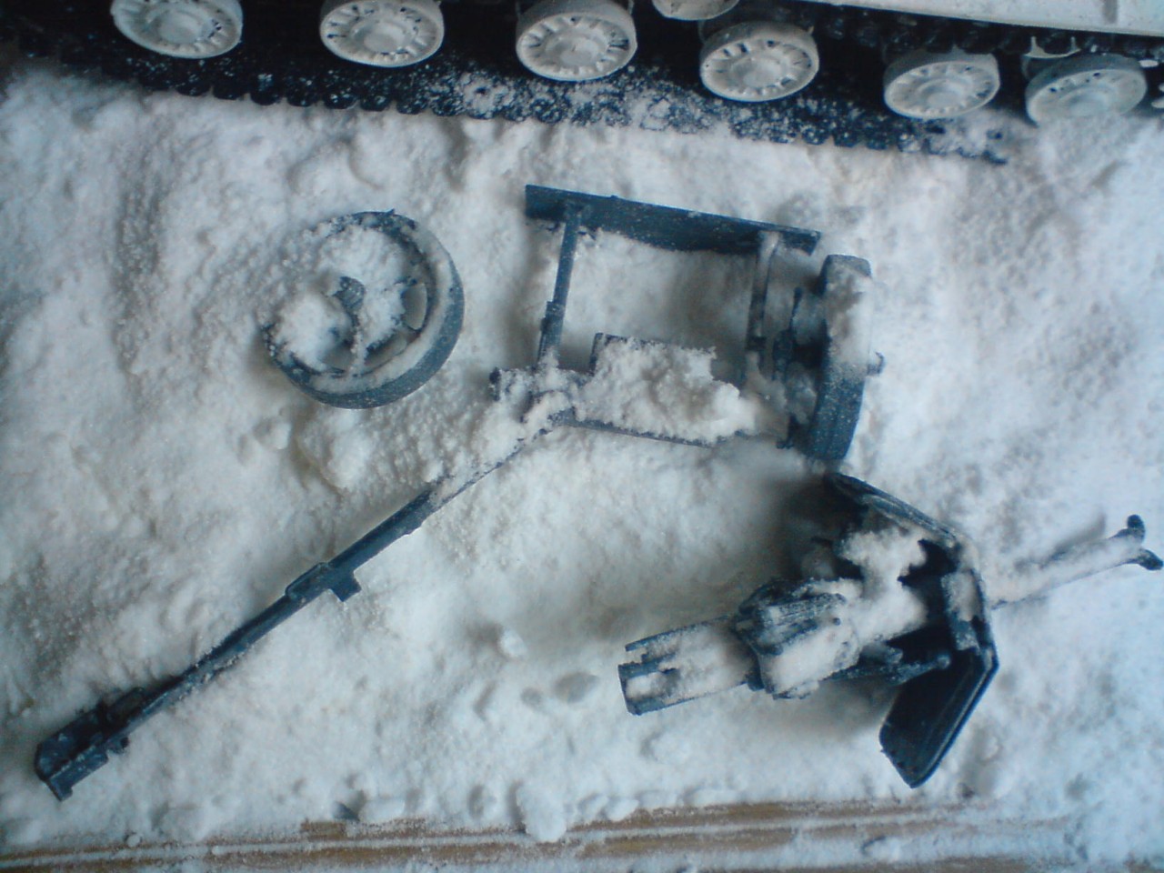 Насчет покраски я полный 0, сам только первые модели решил собрать, а вот облой с колёс пушки надо было, наверное, убрать. Снег наверху гусениц ,скорее всего, должен быть, не может он весь слетать, даже если не влажный.