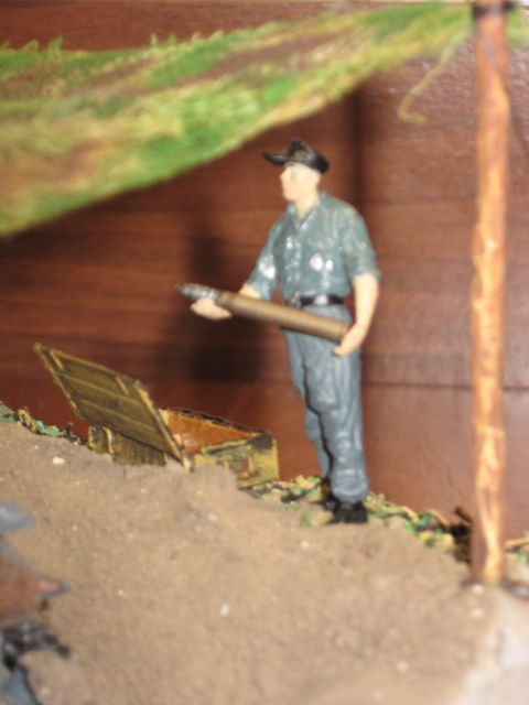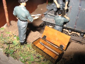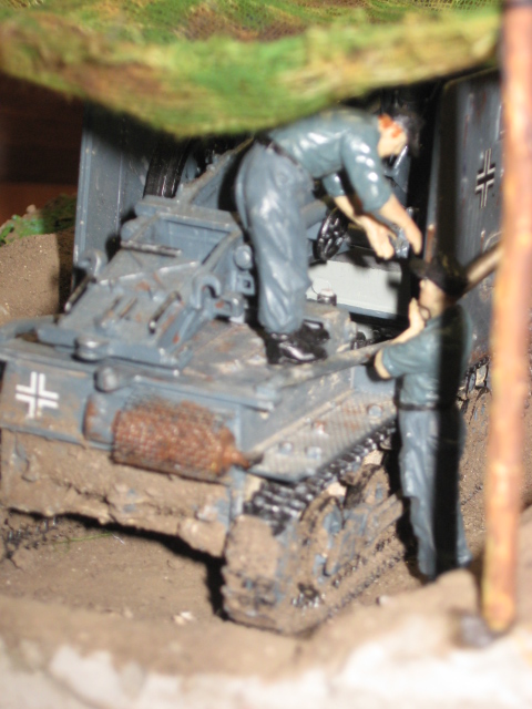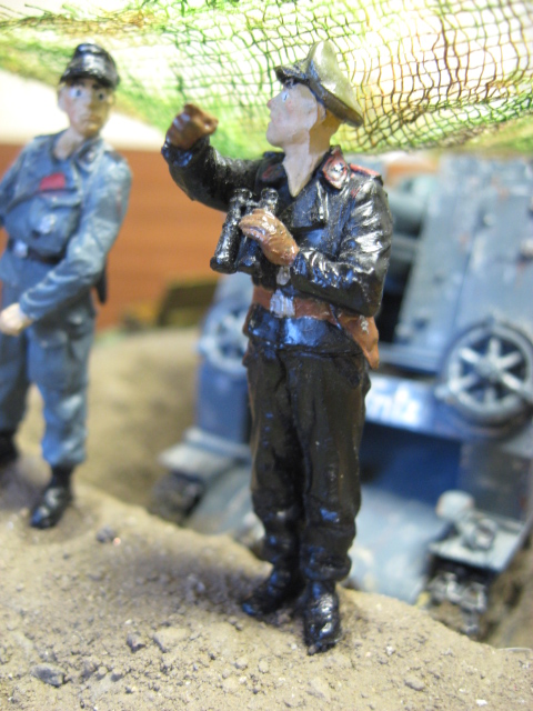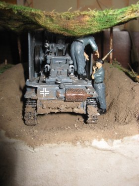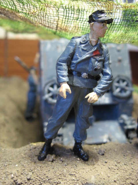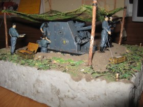 Блеск на всем от гаубицы до фигурок надо убрать однозначно. С фигурками нужно что-то делать в отдельном порядке: в них проблемы с глазами, ушами, руками, со всем короче. При заляпанной грязью ходовой гаубицы очень чистая форма, включая обувь на немчиках. Масксеть тоже не очень смотрится. Надо было листвы какой-нибудь на нее понацеплять, а так марля марлей. Задумка-то интересная, только подходить надо основательней. Думаю, у автора в дальнейшем все получится.