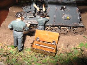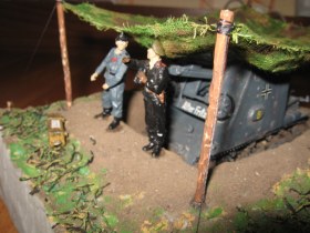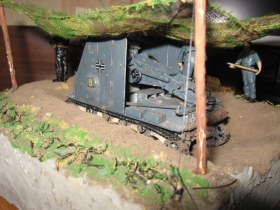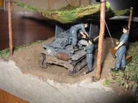 Здравствуйте. Вот моя первая диорама хочу выставить на обозрение. История такова … лето 1941 Россия 2 танковый дивизион обслужующий персонал готовится к обстрелу готовящихся не далеко от укреплений советские войска … Модели: самоходка SIG 33 и обслуживающий персонал модель по сборке легкая траки наборные модель интерьерная, к сожалению, интерьер модели сфотать не смог персонал производства miniart подставка из пенопласта земля настоящая ну вроде все жду критики