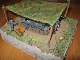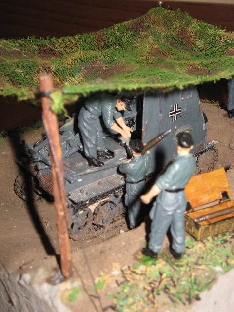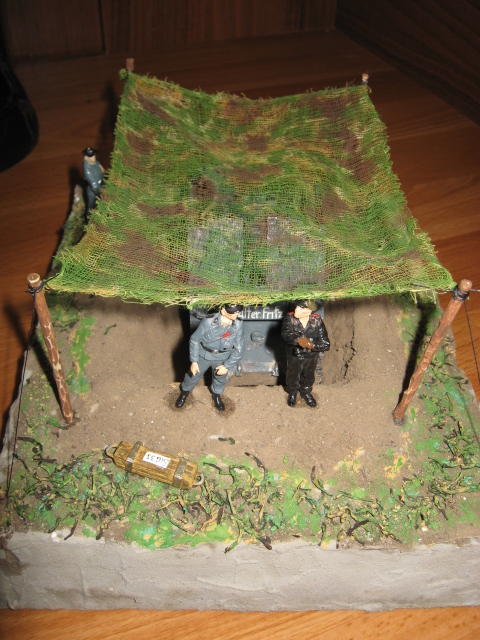 Ячейки у масксети в таком масштабе побольше будут- марля не АйС, окоп сухой а ходовая как из лужи- не грязь надо а пыль, основание маловато- тесно как-то, не надо размещать диораму паралельно краям основания( тот же окоп).