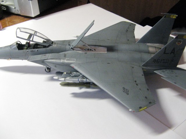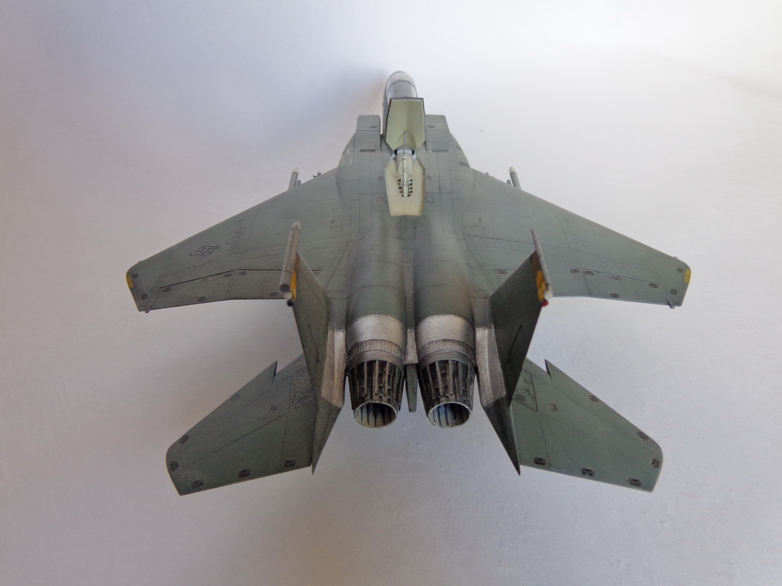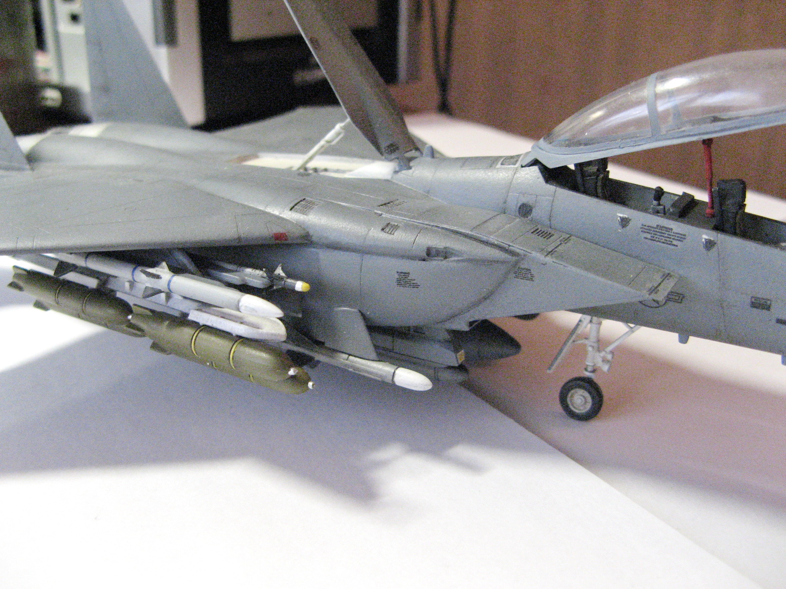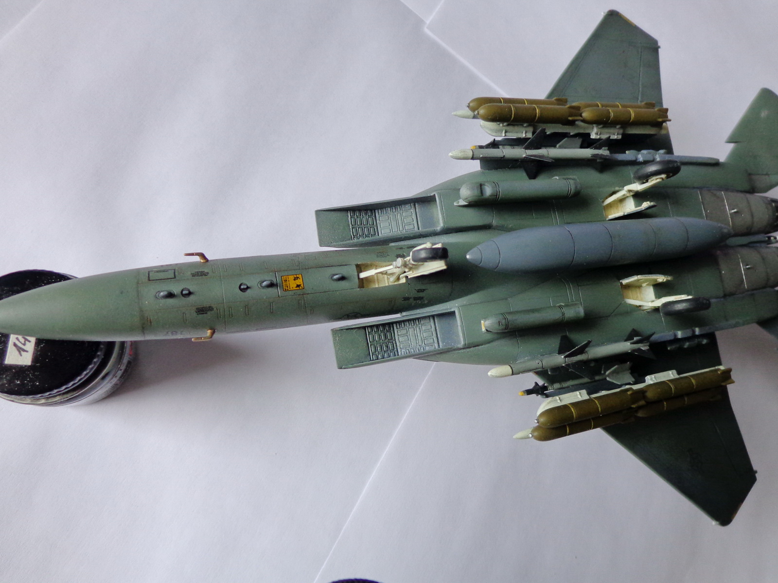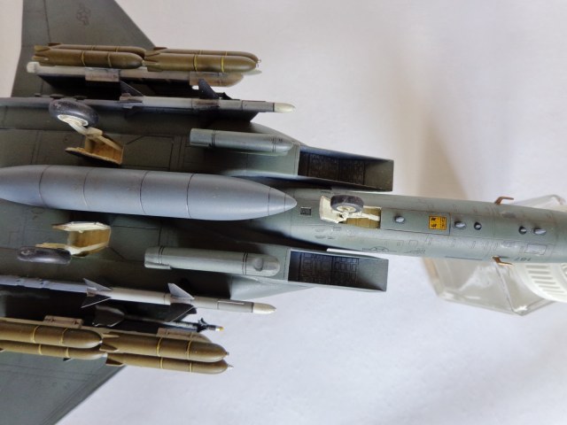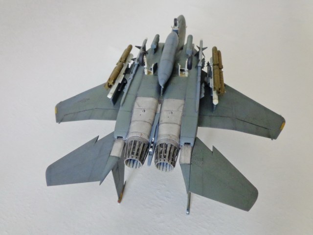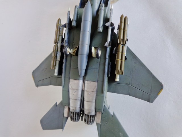 Ни к сборке, ни к покраске претензий нет. Все на высоте. Вобщем мне понравился Ваш ударный Игл, но есть пару косячков. Первый - от производителя - присутствие "ласта" между двигателями. В реальности на модификации "Е" его нет (см. ниже). Второй связан, видимо, со следованием инструкции при покраске вооружения, а именно бомбовые кассеты Мк.20 Rockeye в действительности окрашиваются в белый, а не оливковый цвет.