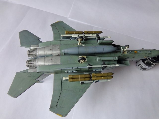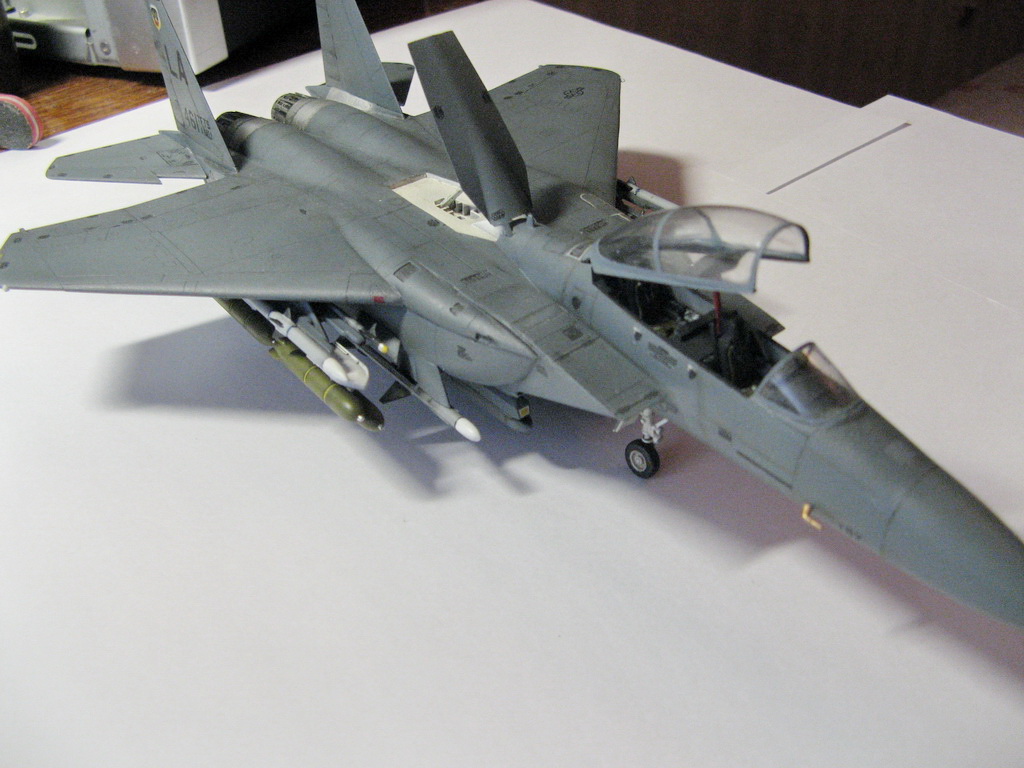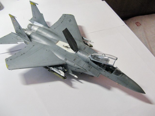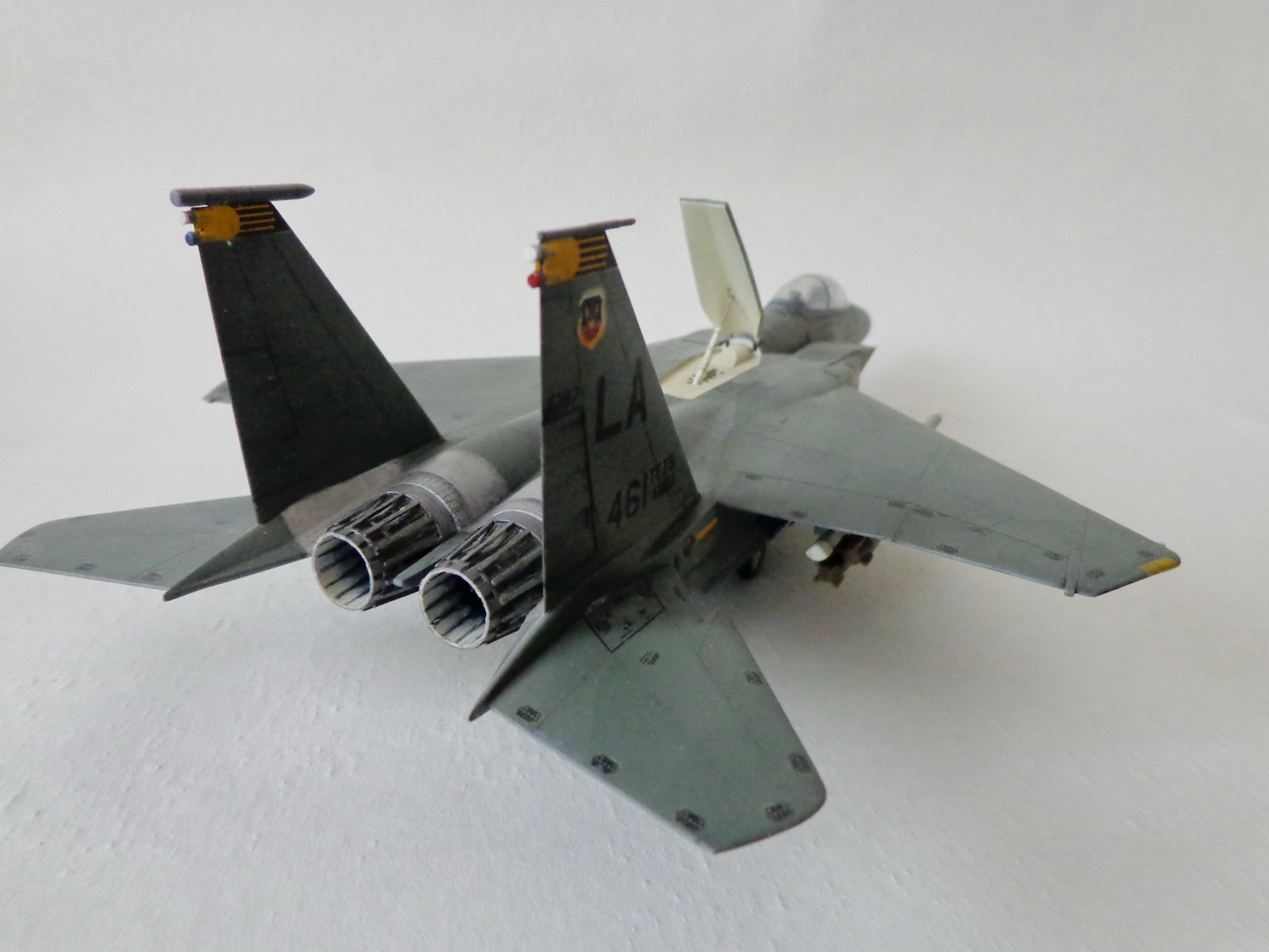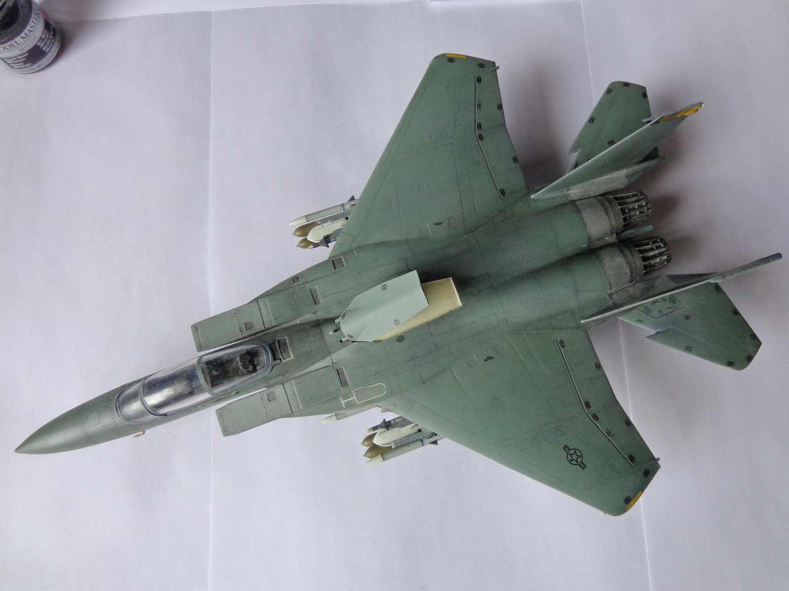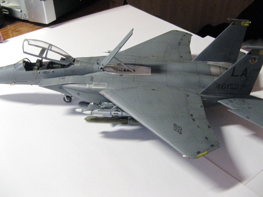Ни к сборке, ни к покраске претензий нет. Все на высоте. Вобщем мне понравился Ваш ударный Игл, но есть пару косячков. Первый - от производителя - присутствие "ласта" между двигателями. В реальности на модификации "Е" его нет (см. ниже). Второй связан, видимо, со следованием инструкции при покраске вооружения, а именно бомбовые кассеты Мк.20 Rockeye в действительности окрашиваются в белый, а не оливковый цвет.