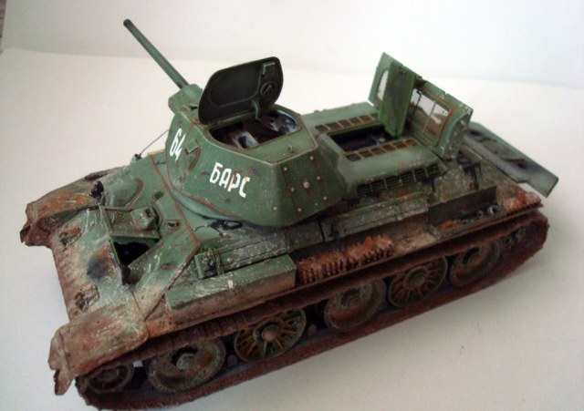 Что касается побитости,ржавчины и сталинградских катков - постараюсь найти и выложить фото данного танка,он,правда,на нём подбитый,но явно видно расположение катков,надпись "Барс" и т.д.Так что повоевала данная машина,с учётом её модификации 1941 года,немало,поэтому и ржавая такая.