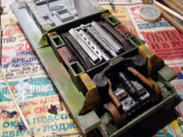 Денис, вы не поняли. про окрас внутренних поверхностей речи нет(не считая ржавых подтеков.)когда я говорил, что окрас не реален, я имел в виду другое-на самом танке столько ржи и масляных разводов (особенно там где их быть не должно),что смотрится это согласитесь не реально. посмотрите в сети как танки достают из рек и болот. даже там они не такие ржавые как у вас. притом, что бревно у вас окрашено и "молодо" выглядит.