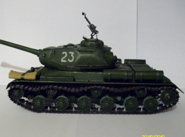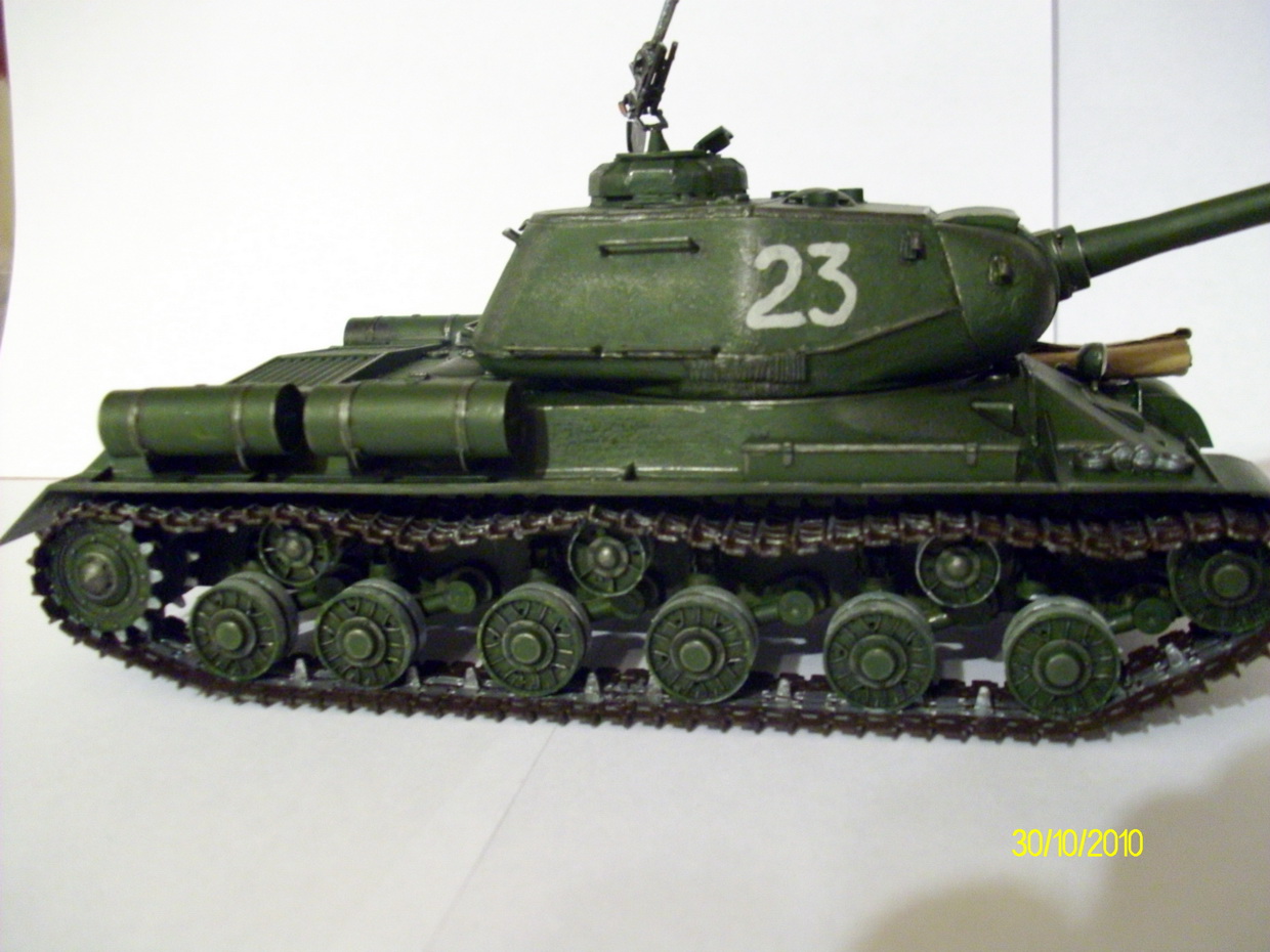 Ну что..есть объект для тренировок..Простейший обгадинг можно делать пастельными мелками..для начала хватит 3-х оттенков..пройдите все закоулки, все места где может скапливаться пыль, грязь..Можно не бояться- не получилось- смываем водой и вперёд...Скатку убрать- на её место уж лучше пару траков кинуть запасных (или сжав зубы- сделать новую скатку)..Пулемёт-не кашерный он..Советую найти ДШК от Звезды и скомбинировать то, что есть с тем набором-это минимум..Буксирные серьги фиксировались двумя Г-образными штырями- в Вашем варианте их легко потерять..Добавьте какого-нибудь шанца..Да хоть лом киньте на полку..Ну и поищите наборные траки от ВЭ..вполне хороши для моделей данной ценовой категории..Удачи! П.С. так как окрасили недавно, не понимаю, почему не исправили явные косяки модели?.тут столько ИСов, можно было и не полениться, инфы-море.. Книжек выложили- читайте)))