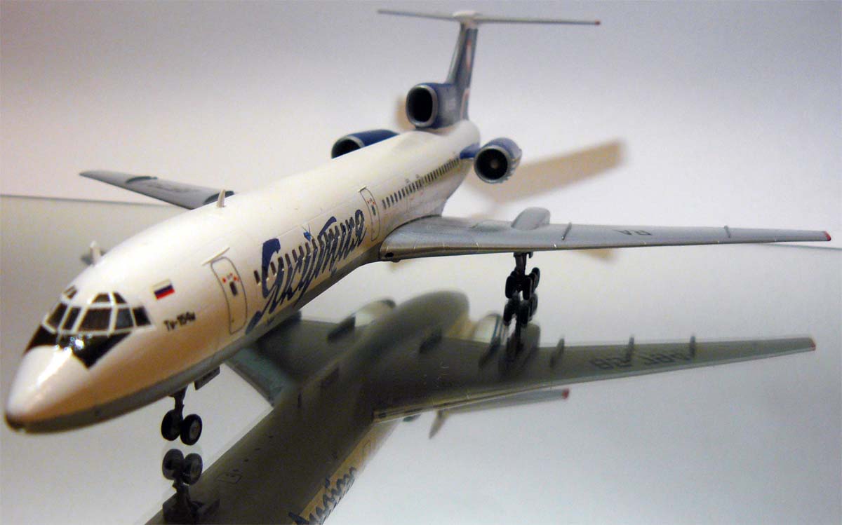 Доброго времени суток уважаемые "Каропчане"! Представляю Вашему вниманию модель авиалайнера Ту-154М ливрее авиакомпании "Якутия". Модель изкоробочная, декаль Ascensio, правда логотип Якутия пришлось вырезать в рукопашную. Декаль не попадает в нужный цвет. Благодарю за просмотр