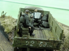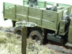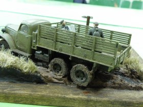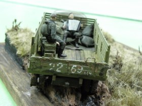 Представляю на суд коллег-моделистов сие творение. Диораму начал ещё год назад и вот закончил. ЗИС сильно доработал: Сделал откидной(задний) борт, замки на нём и цепи. Решётку радиатора вырезал и сделал новую. Внутренности фар оживил маленько.. Защиту фар согнул и спаял из проволоки. Сделал обрезинку на стёклах, а так-же зажимы отсека запаски тоже из проволоки. Это моя первая модель колёсной техники- не ругайте сильно. Просьба оценить грязь очень долго с ней возился.. С уваженьем ко Всем))