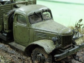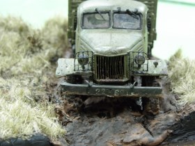 так то вроде не плохо,но почему у зиса колесо заднее висит за диорамой?потом,отсутствует логичность..если есть большое травяное поле и маленькая грязная колея,то зачем лезть в грязь?вылезли бы не поле,на сколько можно..грязь у передних колес как волна вперед двигается..это ж ен вода,она должна наоборот назад лететь