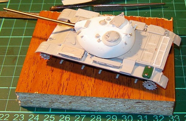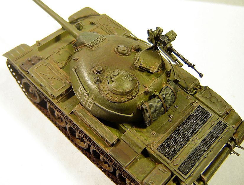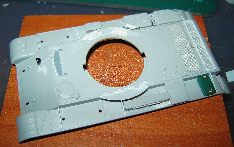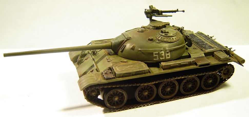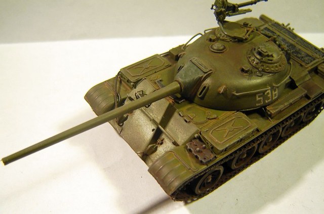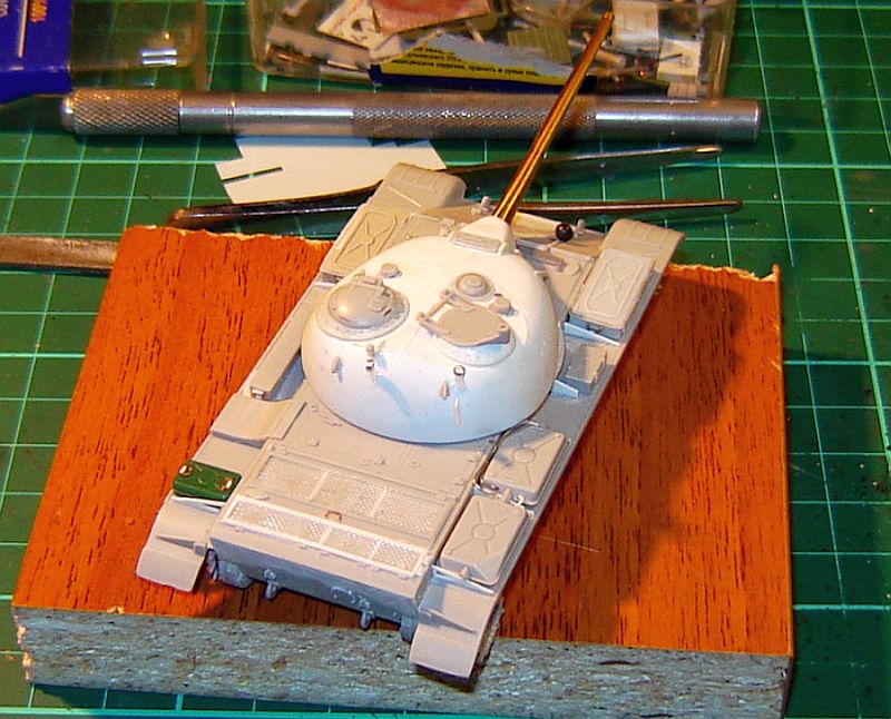 Для улучшения внешнего вида были куплены катки из смолы от Армори, ствол пушки Д-10Т от ModelPoint. С башней возник вопрос, либо править то, что есть, либо ставить другую...Я поставил от АСЕ, т.к. она на данный момент наиболее правильная. На неё "хирургическим" путем пересадил мелочёвку от Трампа. Ящики ЗИП по бортам взял также от АСЕ фарау от Эльфа. Пулемёт ДШК - смоляной от Армори. Решетки МТО переделал ,вклеил сеточку от фильтра какого-то. В процессе окраски понял что сетка "некомильфо" и заменил на "Абер", травлёную.