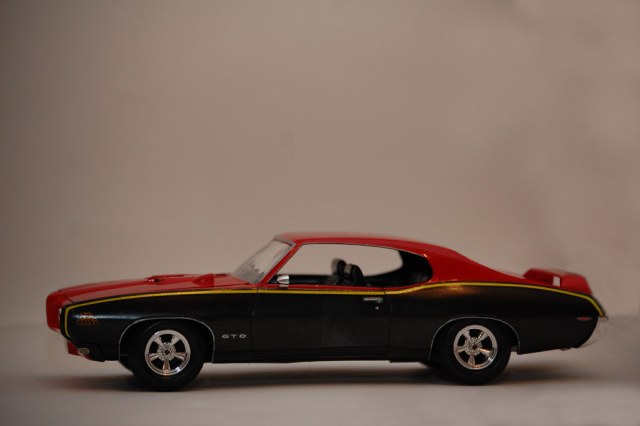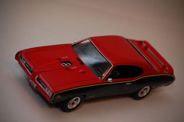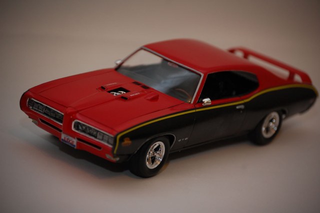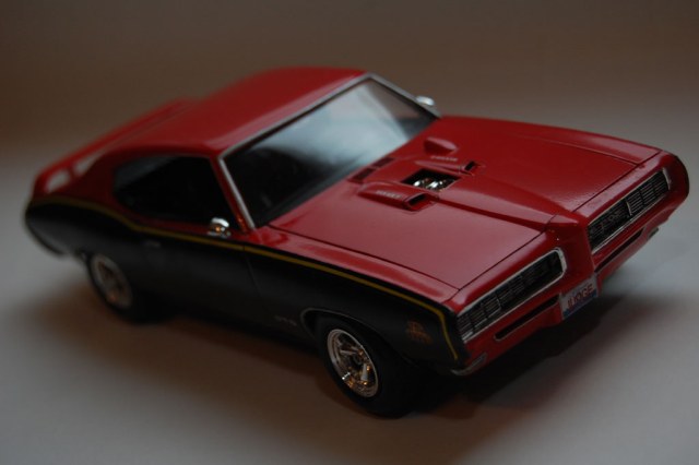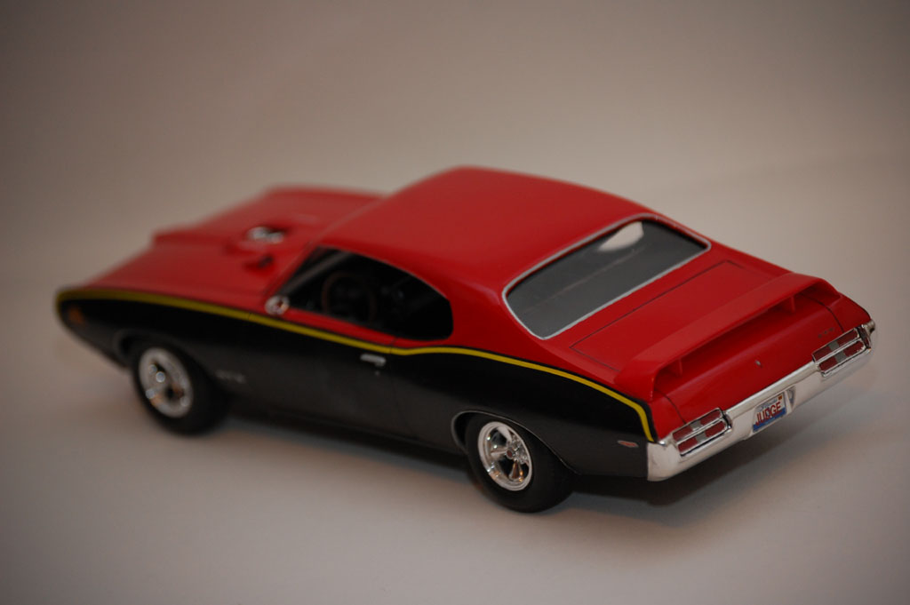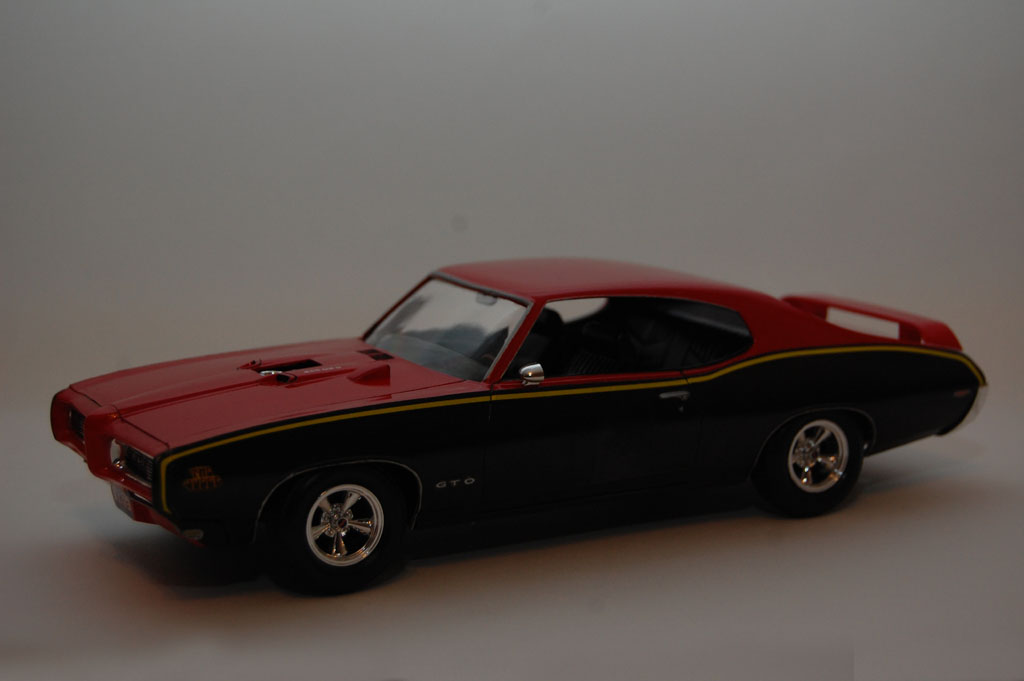 Pontiac GTO Judge 1969 года. Делал для души. Люблю американский автопром... Красился красками TAMIYA. Пока ничего не доделывал, модель целиком из коробки. Планирую добавить проводку и шланги в подкапотное пространство, поэтому фоток двигателя пока не будет, и хромированные выхлопные трубы под пороги.