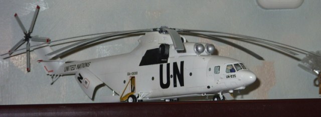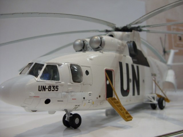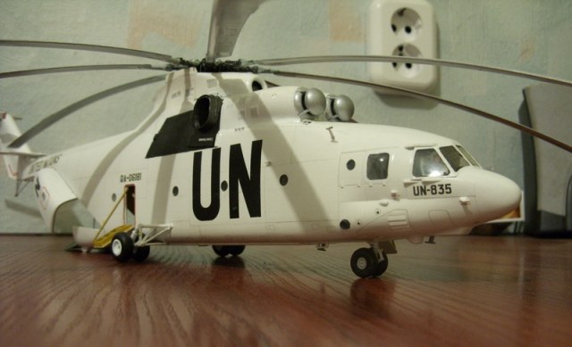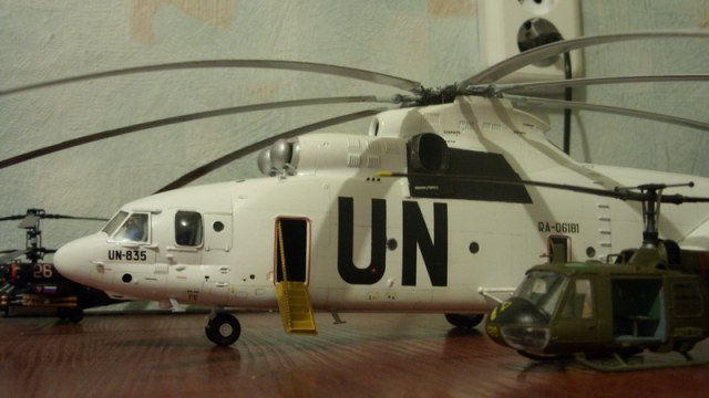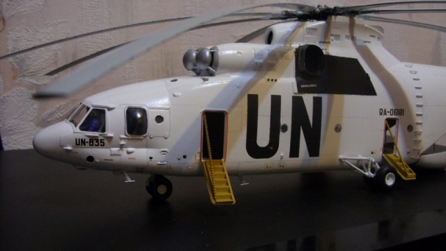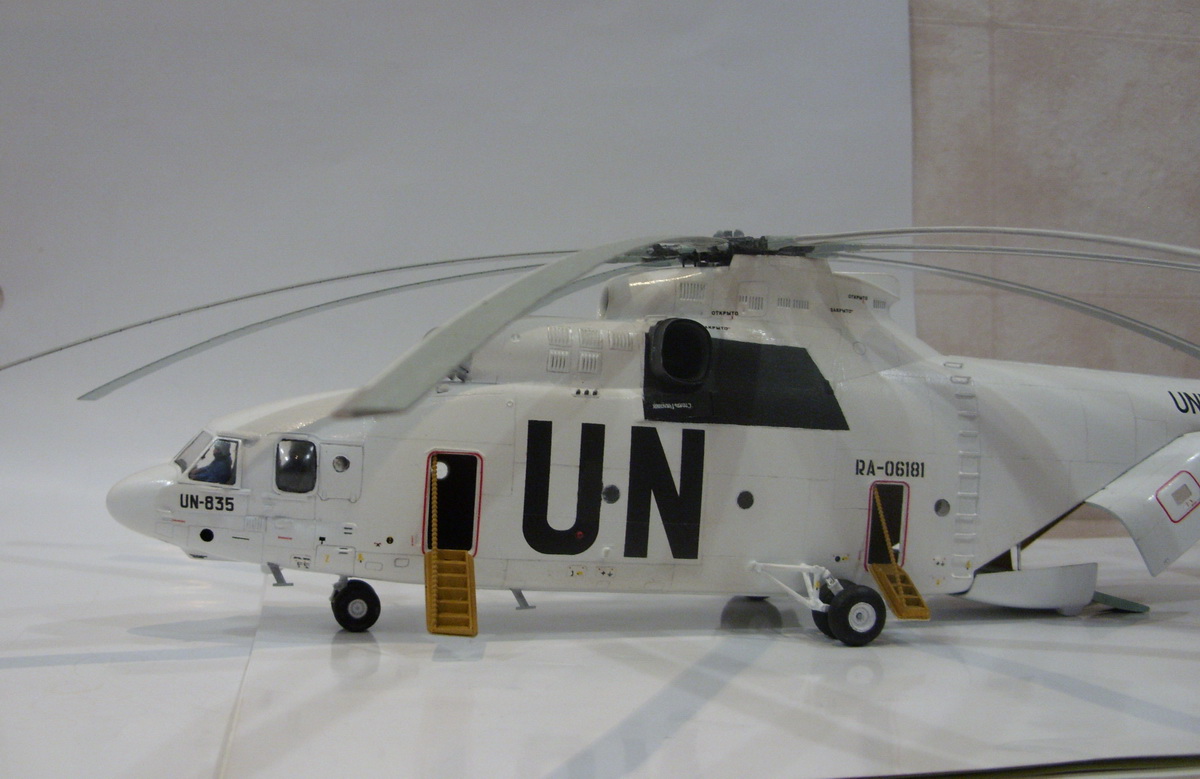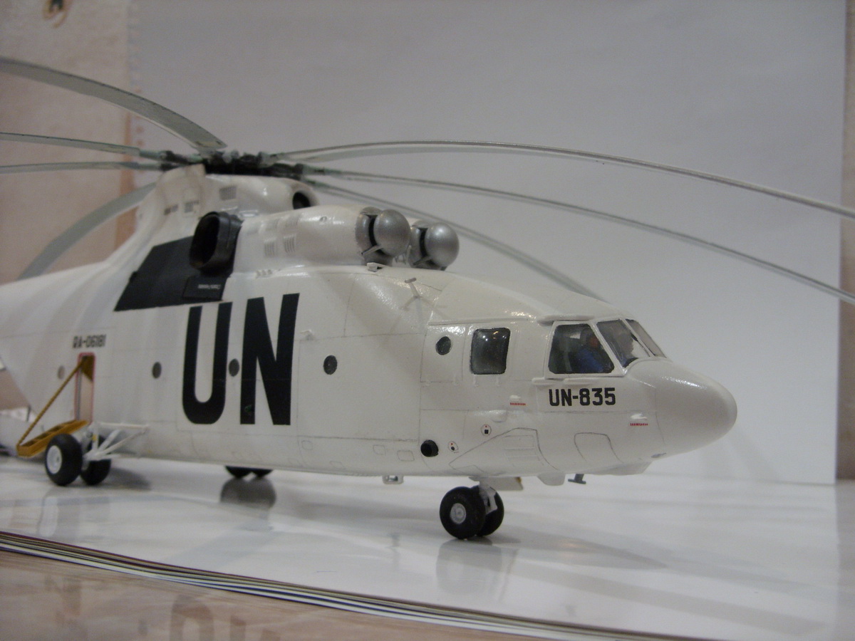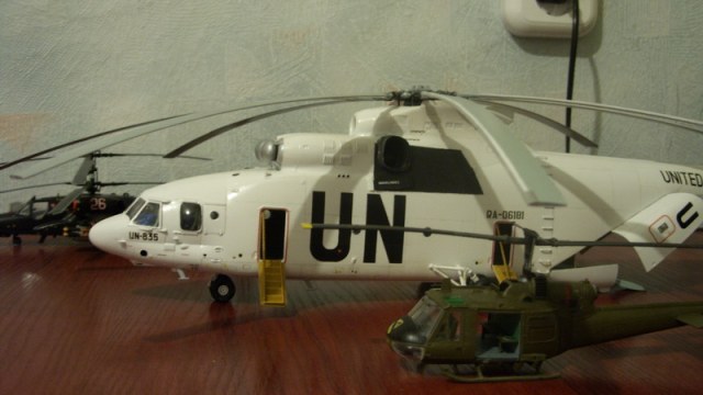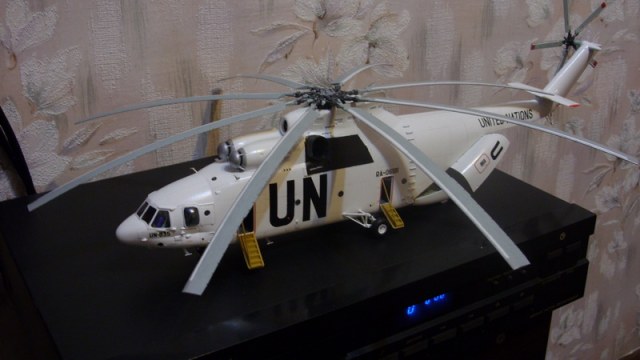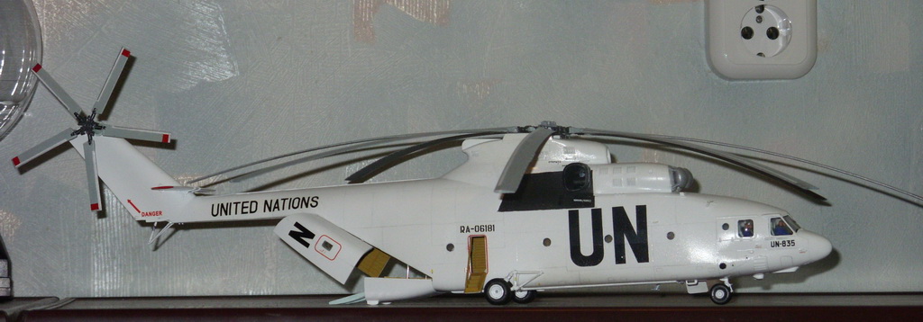 Наконец-то решил выложить тяжеловеса Ми26! Делал долго, времени не было... но и особенно не старался, так что как вышло так вышло (один раз уронили со свежей краской - пришлось снимать). На данный момент не завершен НВ, и мелкие недоделки по фюзеляжу. Хотел МЧС вариант или гражданский современный, но за декали Бегемота с доставкой в РБ выходит жирно, дороже модели в 2 раза :)). Сделал ООН. Краска (по лицу не бить) - аэрозольная в баллоне. В общем, судить вам))