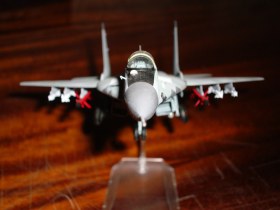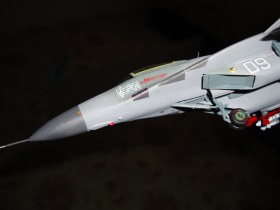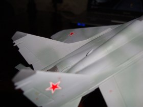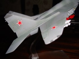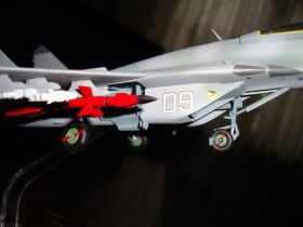 При очень хорошей сборки и окуратной покраске все же присутствуют несколько косяков. Звезды наклеены не верно (не по курсу самолета). Смутил цвет вооружения. Модель на взлете без пилота и с закрытыми воздухозаборниками.
