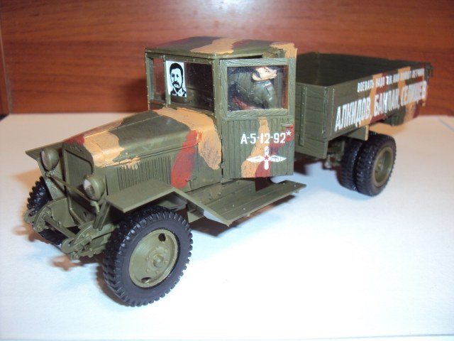 Для начала следовало бы привести сам грузовичок в смотрибельный вид (покрасить полностью, желательно - ориентируясь по фотографиям, хотя бы музейным; имитировать его использованность...), а потом уже "оживлять" его лозунгами, Сталиными и т.п.