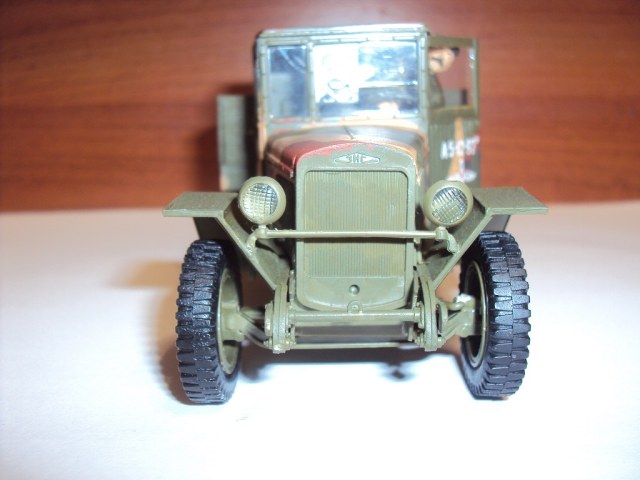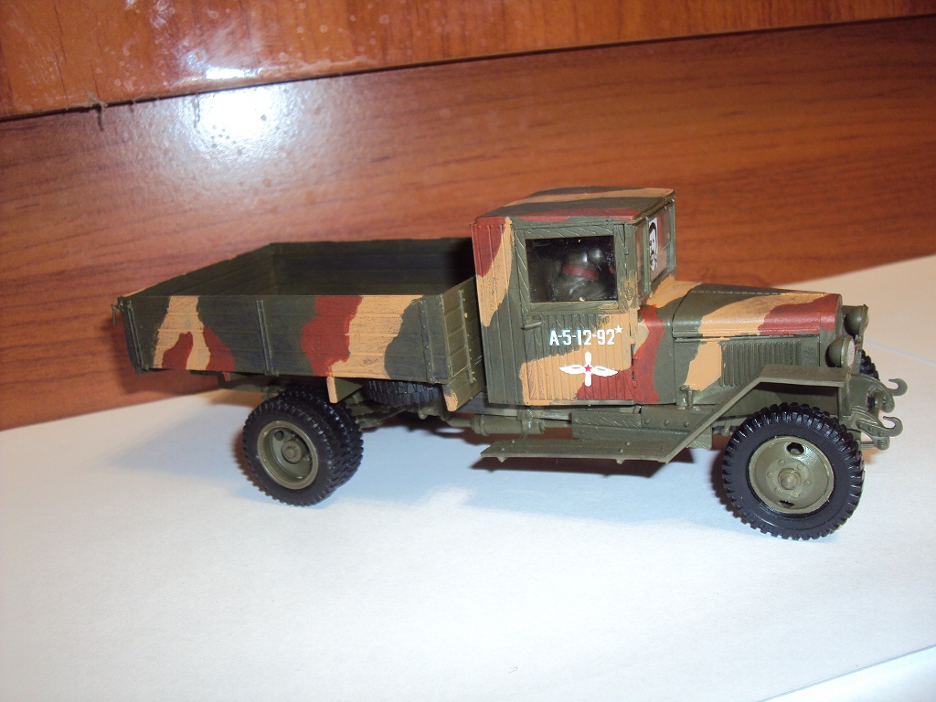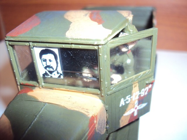У меня такой же дома грузовичёк стоит..только не покрашеный))только я сталина не стал клеить на лобовое стекло - НЕ ЗАСЛУЖИЛ!))) у меня в Кузове этого грузовика всякие мелочи храняться))) Моделька сдена не плохо но я бы на вашем месте ежё постарался окрасить рессоры так, чтобы они приняли чуть ржавый оттенок, сами рессоры так то по моему должны быть черные. Мне камуфляж ваш понравился..особенно на "кузове"! А так для первой модели вполне прилично! разумееться мастерство пиходит со временем))) Моделистом не рождаються - им становяться!