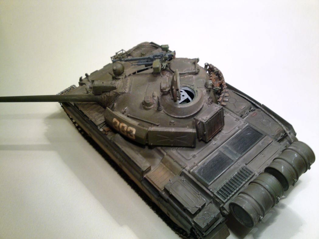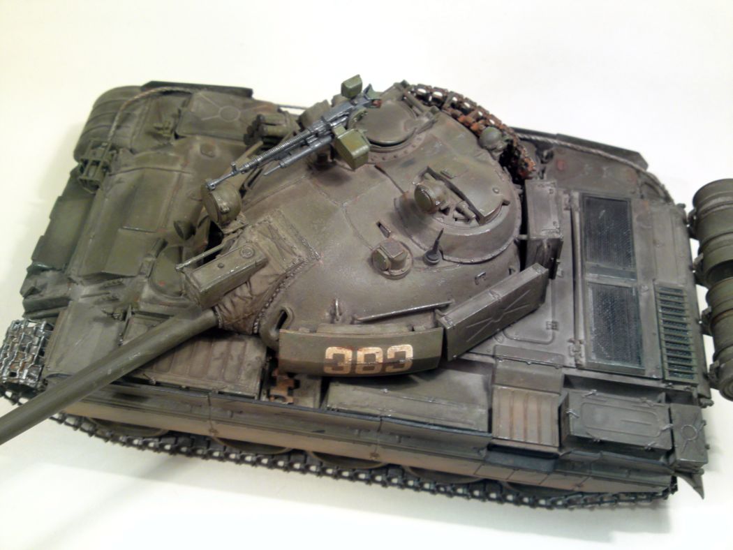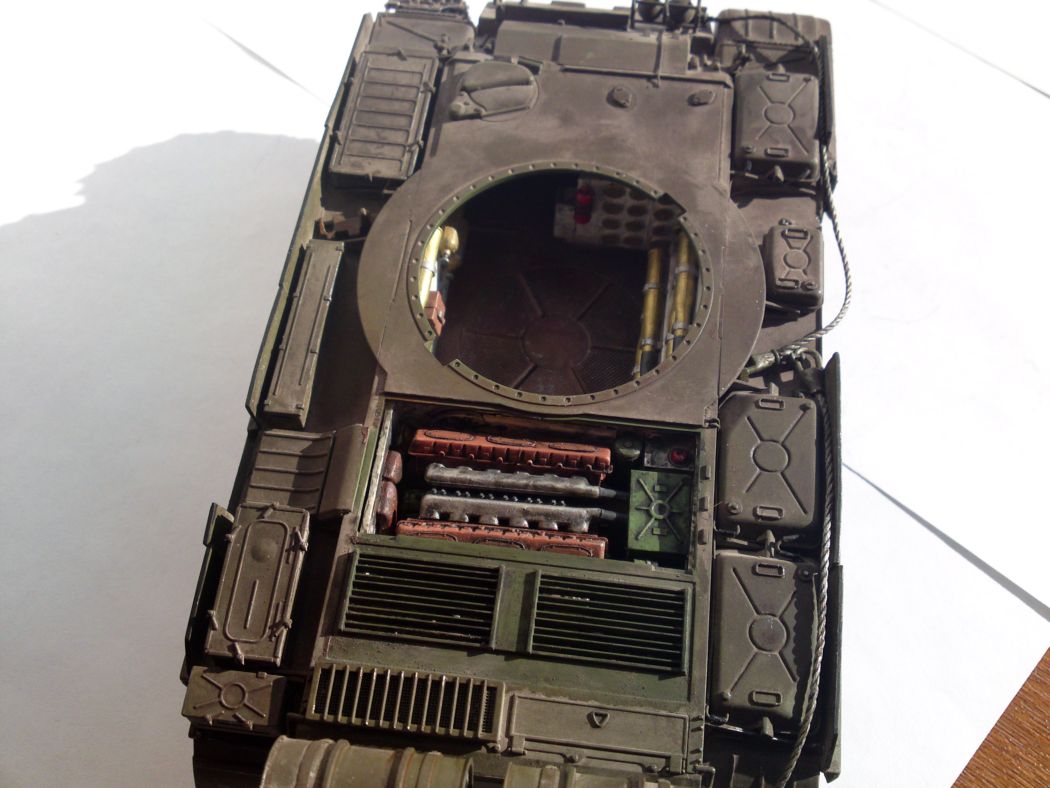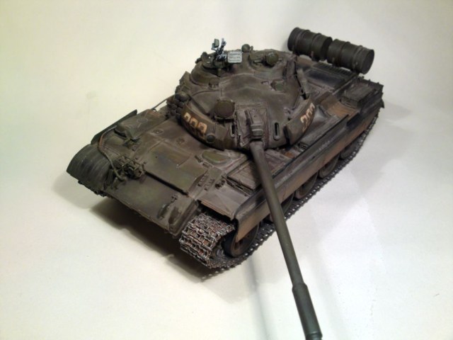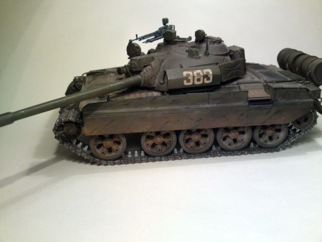 По матчасти скажу одно. Это не "АМ" (которую производили чехи и поляки) и даже не "М" (советская модификация). Дело в том, что вы запутались при сборке модели. Дальномер (штуковина на стволе) у вас советский, у АМ он другой. Так же у АМ должен быть датчик ветра на башне, у вас он отсутствует. Ящики ЗИП на башне - эти признак "европейца", на советских машинах их не было. Так что, если вы хотите, чтобы ваша модель была АМ, то надо сделать хотя бы дальномер и датчик ветра.