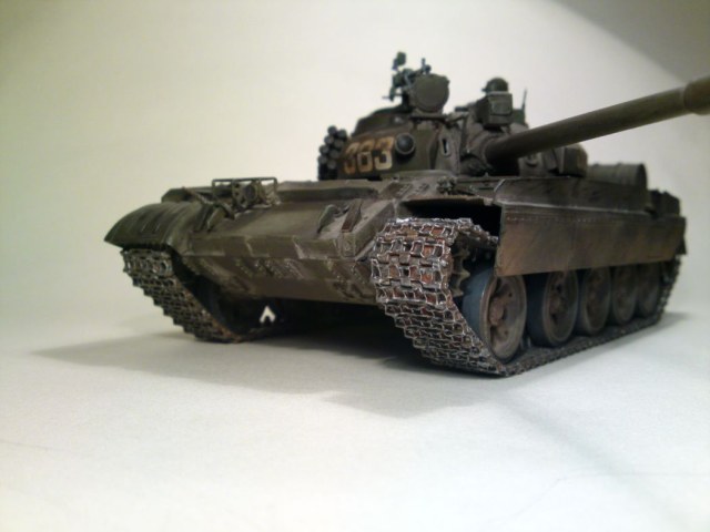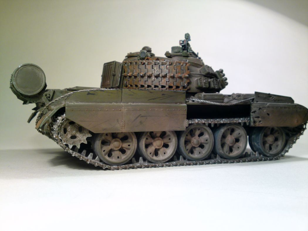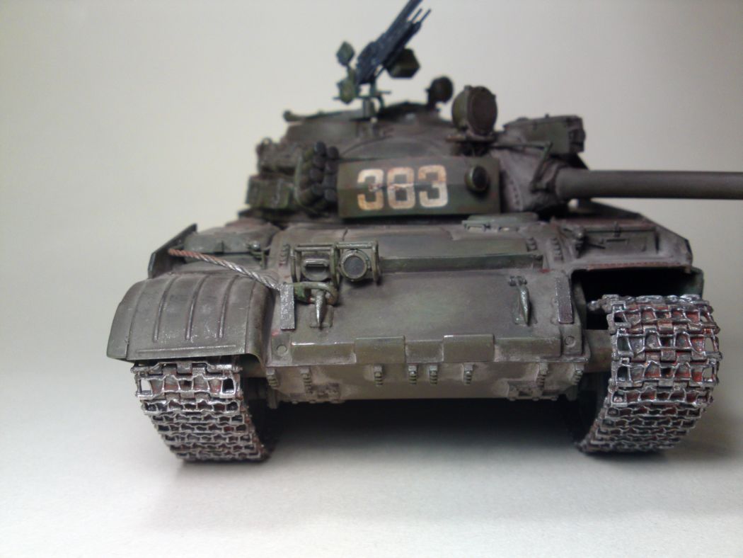 На АМ помойму задние грязевые щитки более поздние стояли, с резиновой обкладкой, Гусянка уже шла с рмш( унифицированная с 72кой) ну и соответственно звездочка с разделительным кольцом, ну и топливопроводы на внешние баки так и просятся, а так модель получилась очень достойная и веьсма интересная