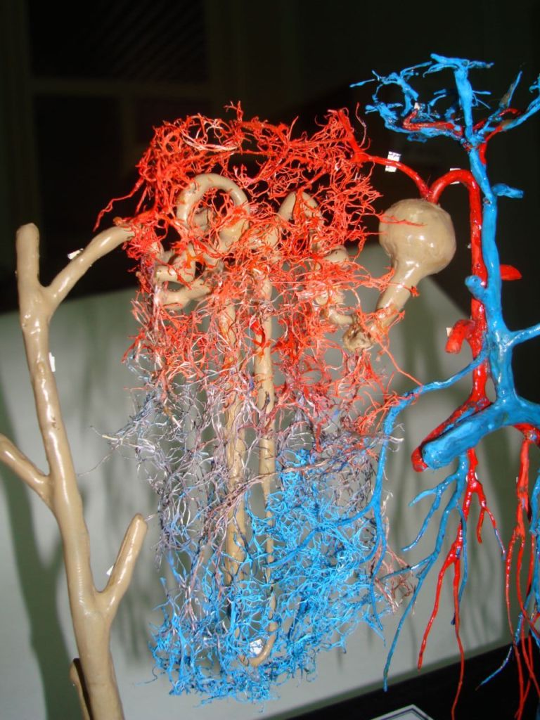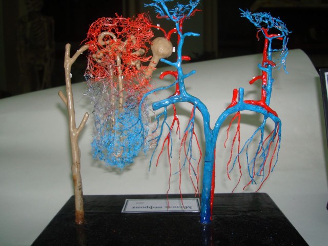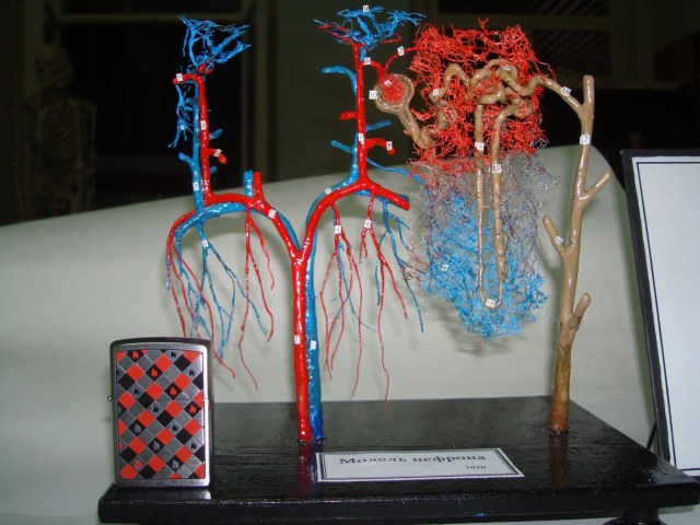 Сначала планировалось делать тельце и сосуды из пластики, на что преподавательница сказала: "Лучше проволоки и воска ничего нет!!!". И делалась модель потихоньку. Потом наступил период окраски. Одним прекрасным днем я прихожу в мастерскую и вижу там преподавательницу, красящую сосуды эмалью. После короткого разговора и объяснения, что такое акрил, аэрограф, грунт, компрессор к окраске приступил я. Сам нефрон покрашен АКАНовским Dunkelgelb и покрыт глянцевым лаком того же производителя. Капилляры - губка вымоченная в краске.
