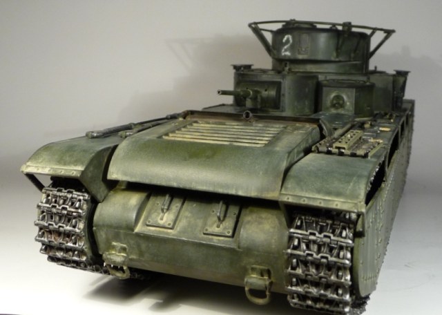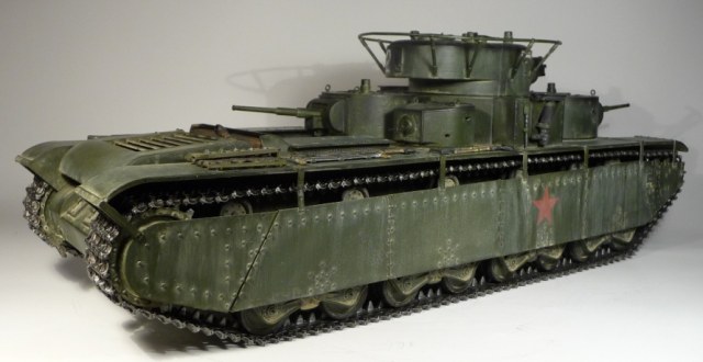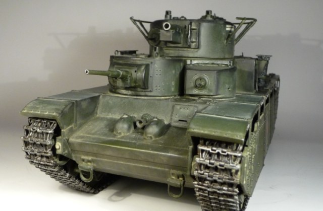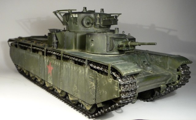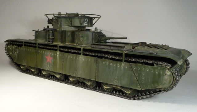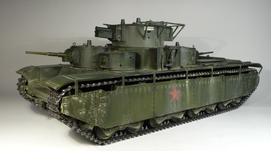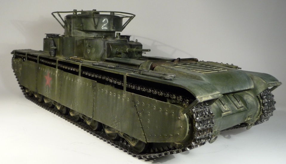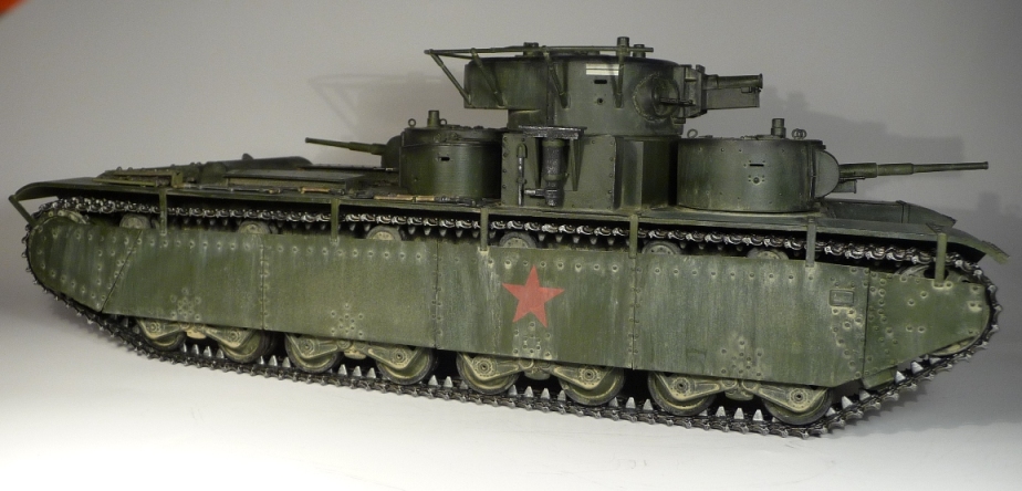 Только что закончил очередную модель-"новинка" от Алангера,всем известный Т-35 .По моему мнению,самый бесполезный советский танк.Т-35 участвовали во всех парадах в Москве и Киеве,но боевая карьера его оказалась неудачной.Всего было выпущено 62 машины,из них 6 или 7 машин были потеряны в боях,остальные брошены экипажами из-за различных поломок.Тот,который сейчас видим в Кубинке,находился в Казанском танковом училище,поэтому и уцелел.Кому интересно, по этой ссылке http://grayknight.narod.ru/T-35_info/Memoirs.htm воспоминания человека,служившего на Т-35.С его слов на тыльной стороне башни изобразил цифру 2 -2-я рота,она была нарисована мелом для опознавания танков своего подразделения.Танк из состава 8 мех. корпуса,34-й танковой дивизии,67 танкового полка.Эта часть дислоцировалась на момент начала войны юго-западнее Львова.
