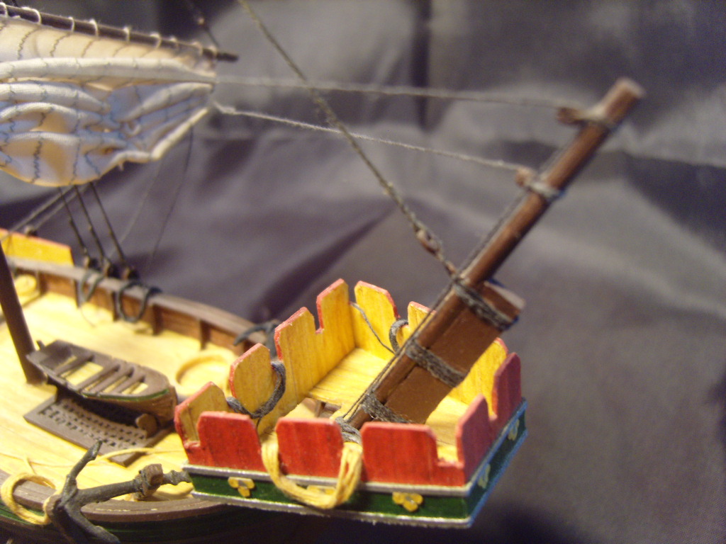 Случайно, лет 10 назад, а может и больше, нашел в антресоли старые журналы. Немного напылив в комнате, отыскал выкройки сего судна. Почему-то решил построить этот корапь, чем мотивировался выбор сейчас даже не скажу. Деталировка выкроек обещала на выходе совсем не симпатичный кораблик, но опыт сборки бумажных моделей был приличный. Не долго думая, симитировал настил палуб, обшивки, элементы декора отдельными полосками бумаги . Парус не помню из чего делал, но сам прошивал на швейной машинке. Блоки делал из спичек, когда сверлил отверстия изрешетил иголкой пальцы(сверел такой толщины тогда не было). Флаг разрисовывал пастой красного цвета на ткани. Сам кораблик раскрашивал сухими акварельными красками.