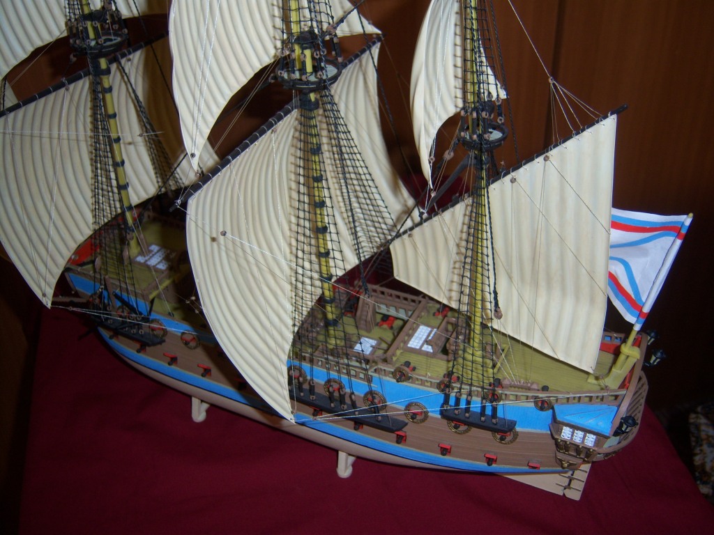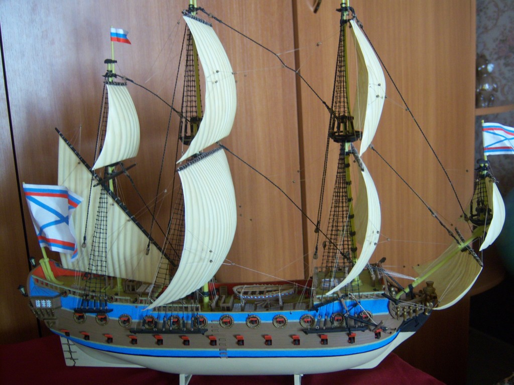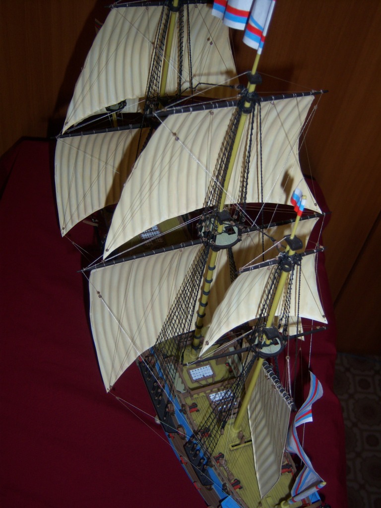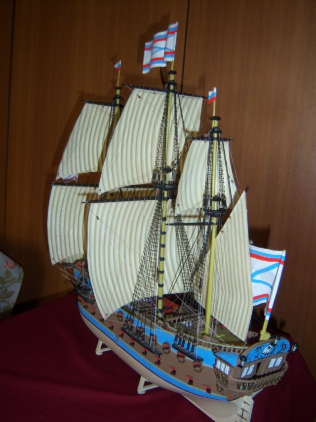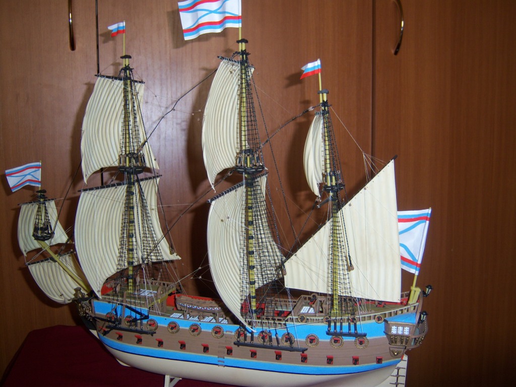 Всем привет ! Вот и закончилась стройка моего первого в жизни парусника. Длилась стройка больше года, на ноябрьские праздники в прошлом году решил прикупить себе эту модель, в старой оригинальной коробке Огонька. Модель всем известная, много описывать ее не буду. Облой вырубался, зачищался, а так, ничего себе качество. Меня как первопроходца она устроила. Красилось всё акрилом от Звезды, совсем не красилась палуба, мачты. На палубе сделал подобие смывки, для выделения отдельных досок. Ванты вязал из швейных ниток № 10(вантины) и № 40(выбленки).Пробовал сначала на раме, неудобно. Удобнее вязать на модели. Для стоячего такелажа использовал капроновую нить, красил в черный цвет, бегучий такелаж сначала начинал ставить из белых швейных ниток, но начал бесить обильный ворс. Нашел в "Медтехнике" хирургический нейлоновые нитки, остался ими доволен. Их окунал в морилку для дерева, чтоб не казались чисто белыми. При вырезании пластиковых парусов (тех, что имитируют убранные паруса) испортил их. Пришлось ставить большие паруса, они собой закрывают весь вид на палубу. Блоки имитировал мелким бисером. Считаю, что за время стройки многому научился, перечитал много литературы, общался с людьми здесь, на Скале. Работы коллег на модельных сайтах очень вдохновляли, посмотришь на них и получаешь кучу энергии. Благодаря этому и закончил работу.