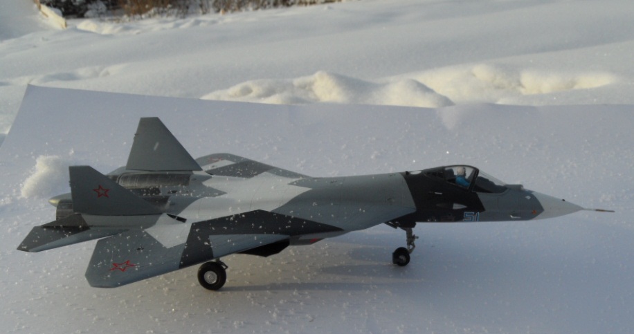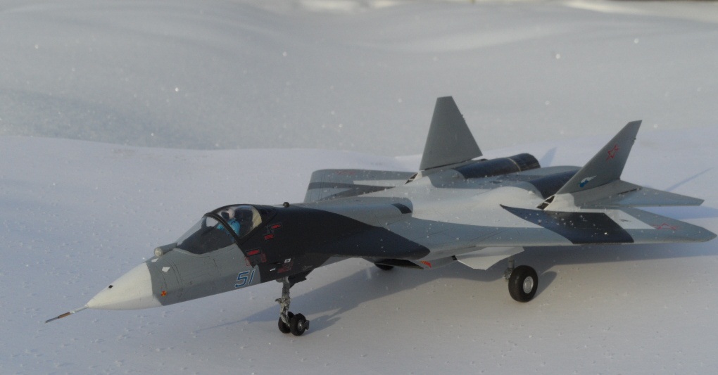 Привет всем, представляю вашему вниманию новинку звезды - пак фа, модель собирается очень даже прилично, можно обойтись без шпаклевки, еще когда покупал модель , думал собрать ее изкоробки, не вышло , пришлось задействовать стойки шасси от исм су 27 , задние колеса, а вот передние за неимением лучшего оставил из набора, в общем моделька приятная и свои деньги она стоит, поэтому приобрел я 2 набора, второй буду дорабатывать деталями из смолы, открою люки и кабину, в общем планов много , может летом займусь. Эта модель у меня как пробная. Долго думал над выделением расшивки и все же немного выделил а то совсем плоско было, деки заблестели с дуру как только их приклеил вынес модель на мороз сфоткать и вот результат они не успев высохнуть толком замерзли, счас буду их спиртом приваривать, ну в принципе все .