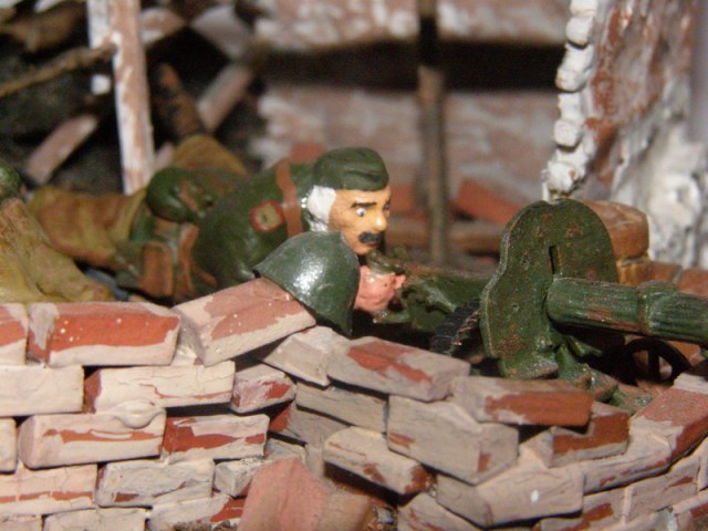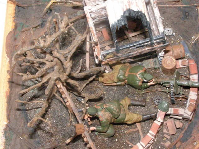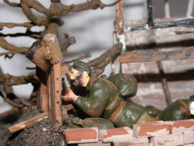 Часть солдат из набора от "Звезды" "Пулеметчики" использовал в данной работе. Она высталялась раньше на старой каропке...После некоторых доработок вновь выставляю ее здесь. Легенда такова: В одной из сожженных немцами советских деревень "обустроились" солдаты ( в нашем случае 2 солдата) для того, чтобы подавить отступающие дивизии немцев. Все условно, никакой точной исторической привязки. каждый патрон и каждая граната на счету, но назад дороги нет. Либо сейчас, либо никогда. Лица взволнованы, затвор передернут. Ждем....