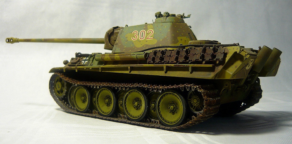 Модель была куплена ради интереса к 48 масштабу, чтобы понять, что это такое и с чем это едят. Справедливости ради надо сказать, что Тамия как всегда на высоте в смысле качества, а вот копийность, особенно нижней части корпуса, из за полностью отлитого оного из силумина не впечатляет. Из коробки модель собирается очень легко и быстро, но я решил усложнить себе жизнь покупкой травления от Eduard. Также были куплены троса из металла и гуси от Friul . Последнее время я почти на всех моделях использую траки этой фирмы : во первых нервная система дороже, а во вторых - лучше потратить денёк на сборку этих траков и получить вполне приличный результат, чем убить кучу времени на сборку, подгонку, неудобство при окраске, а затем установку и , как вариант, испорченные при этом пластиковые штатные траки при сомнительном качестве и зрелищности последних. Говорят, смоляные траки от московского Танка ещё шикарнее и при этом тоже рабочие, но я остерегаюсь их из за хрупкости смолы. И ещё один плюс металла - это его вес. Модель с такими траками приятно тяжела. С ними проще работать при окраске и установке на модель. А главное - под собственным весом траки принимают очень реалистичный провис в тех местах, где ему (провису ) и положено быть. Единственный минус - это их цена. Не сочтите это всё за рекламу и призыв к покупке этого прибамбаса, это просто моя точка зрения. А теперь немного самокритики. Так называемый засадный камуфляж применённый мной на этой кошаре характерен для весны-лета 44 года, а сама Пантера Г самых последних серий, собранная мной , относится скорее к началу 45 и до последних дней войны. Но я пошёл на это сознательно - хотелось попробовать воспроизвести именно этот камуфляж. Честно говоря, по-моему, первый блин вышел комом. Что получилось - судить вам. На этом, как говорится, спасибо за внимание. P.S. Фальшборта к этой Пантере тоже имеются и также покрашены в засадный камо, просто мне стало жаль закрывать ими красивую линию провиса гусениц.