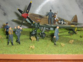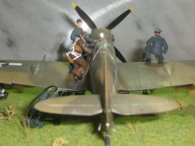 Выкладываю свою первую работу на этом сайте. Это вообще первая моя диорамка. Spitfire Mk. VIII - производство ICM с небольшими дополнениями (ремни в кресле пилота, приборная доска, огни АНО). Лётчики и техники также ICM, кислородные балоны дополнены шлангом с наконечником( кусок мягкого провода, наконечник - тянутый литник).