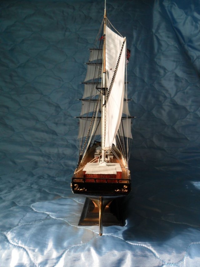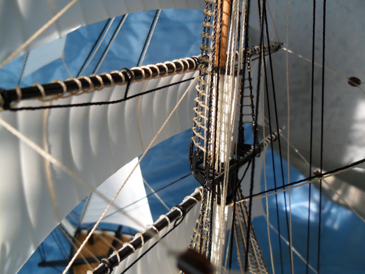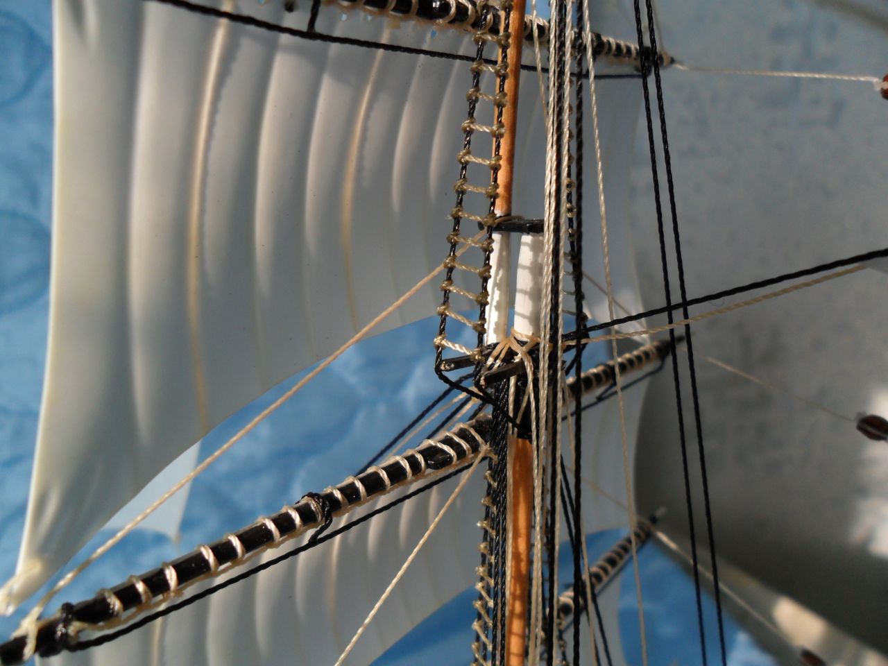 Не хочется портить общий 'пазитивный' настрой. Блоки крупноваты. Надо бы раза в два мельче. Достаточно капли клея. У кливеров и стакселей /треугольные паруса/ должно быть по два шкота. Правый и левый. Можно было сделать фалы и прочий такелаж подробнее. Перты на грот и фок и на марсареях крепятся посередине мачты. Подпёртков должно быть больше минимум по два. Посмотрите фотографии Седова или Крузенштерна.