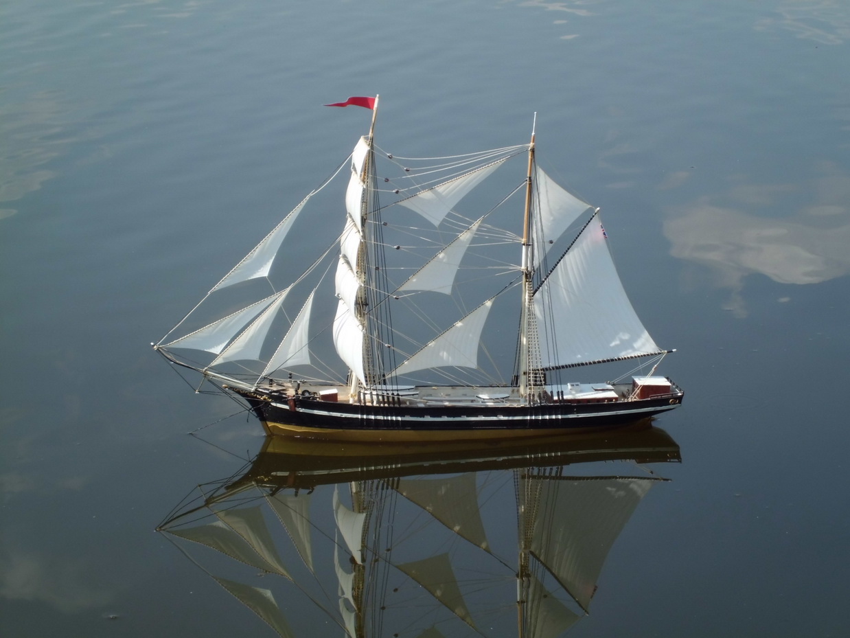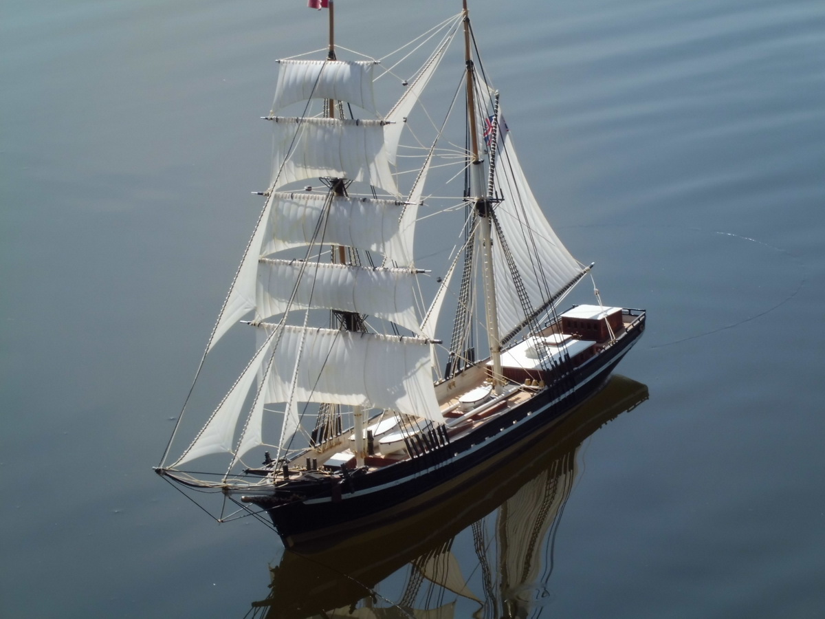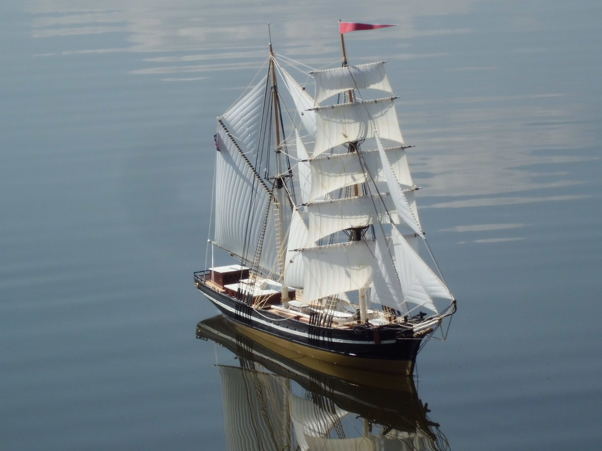Не хочется портить общий 'пазитивный' настрой. Блоки крупноваты. Надо бы раза в два мельче. Достаточно капли клея. У кливеров и стакселей /треугольные паруса/ должно быть по два шкота. Правый и левый. Можно было сделать фалы и прочий такелаж подробнее. Перты на грот и фок и на марсареях крепятся посередине мачты. Подпёртков должно быть больше минимум по два. Посмотрите фотографии Седова или Крузенштерна.