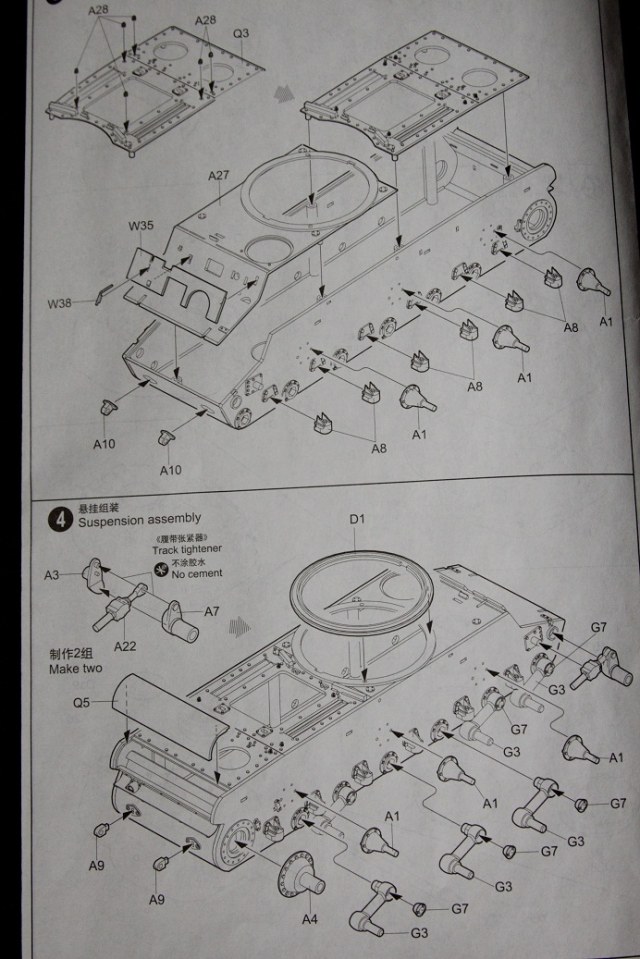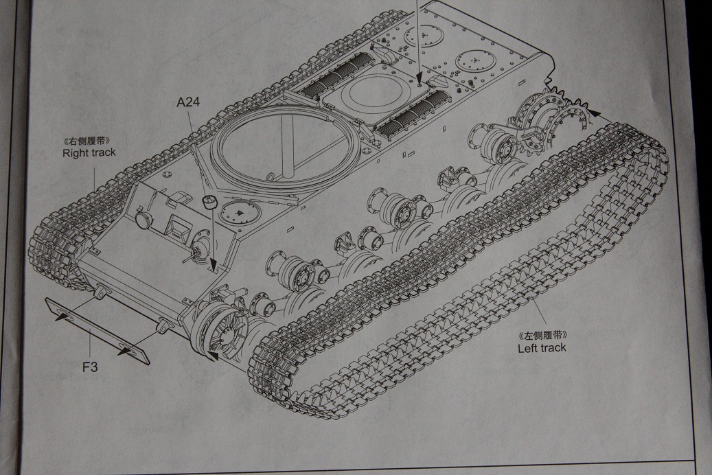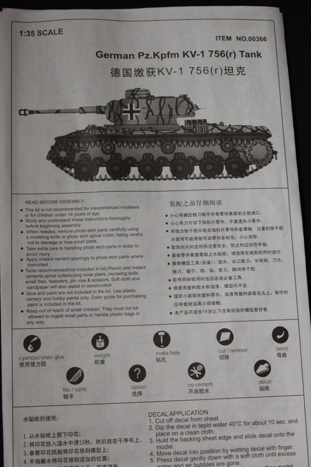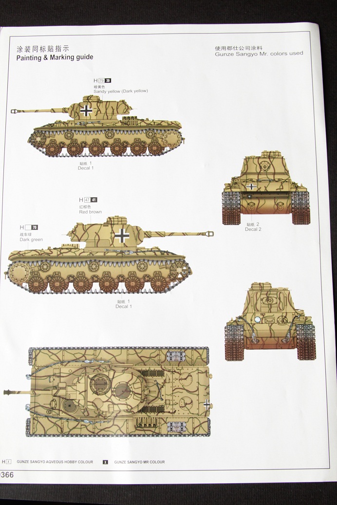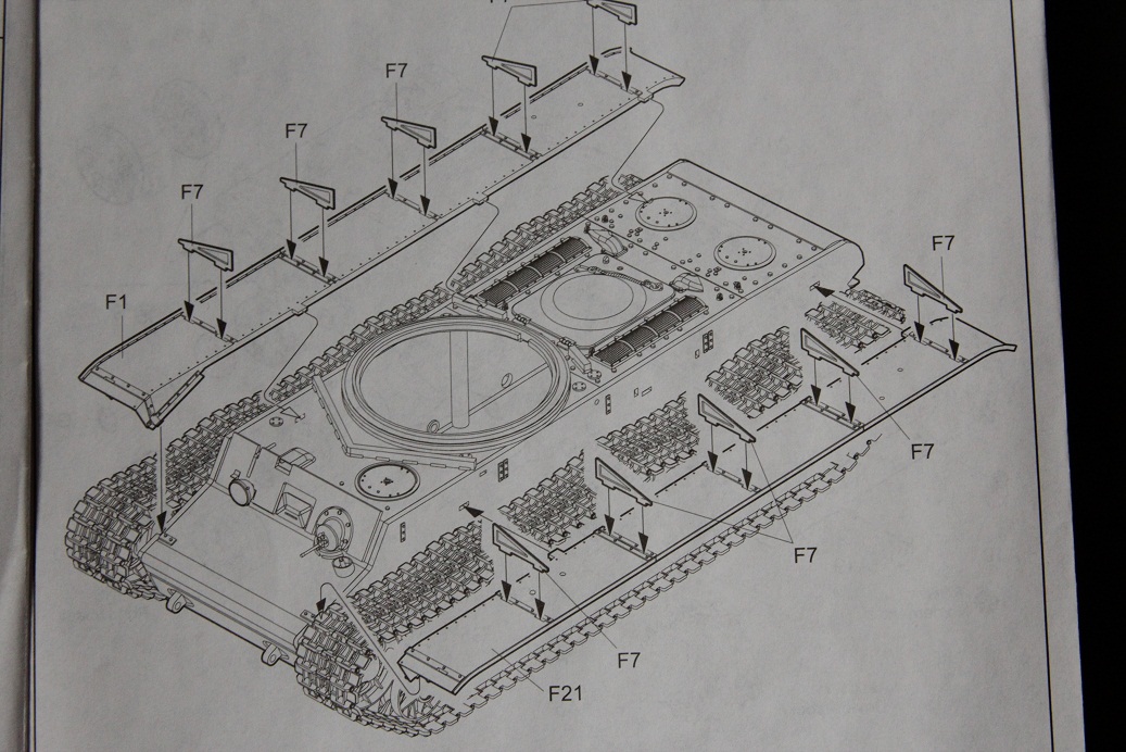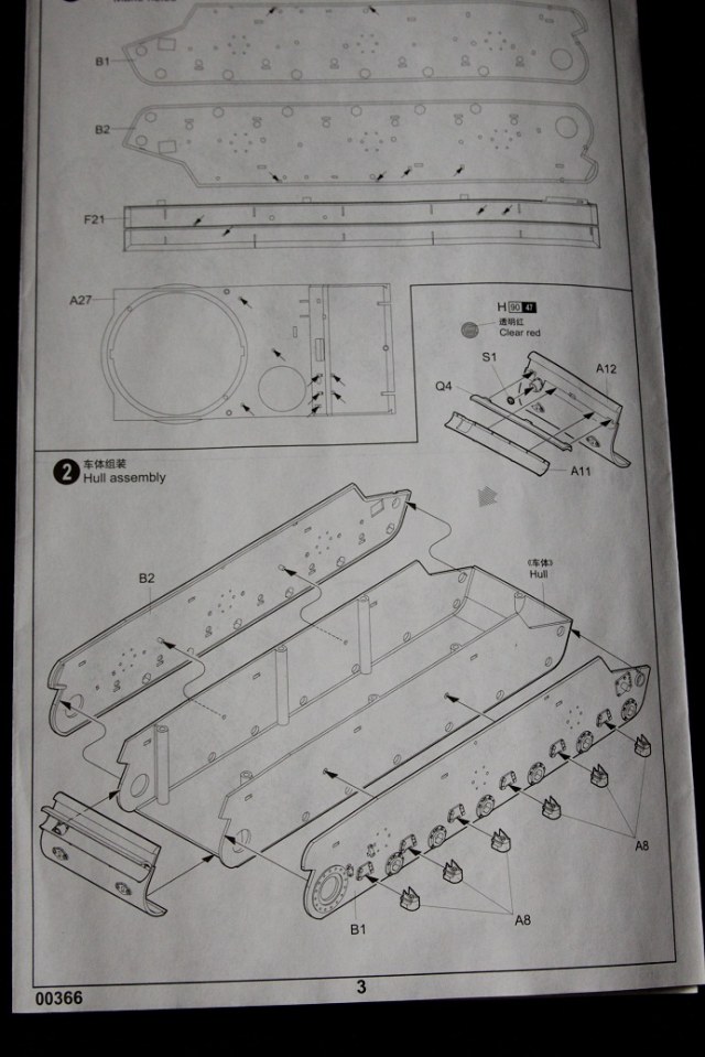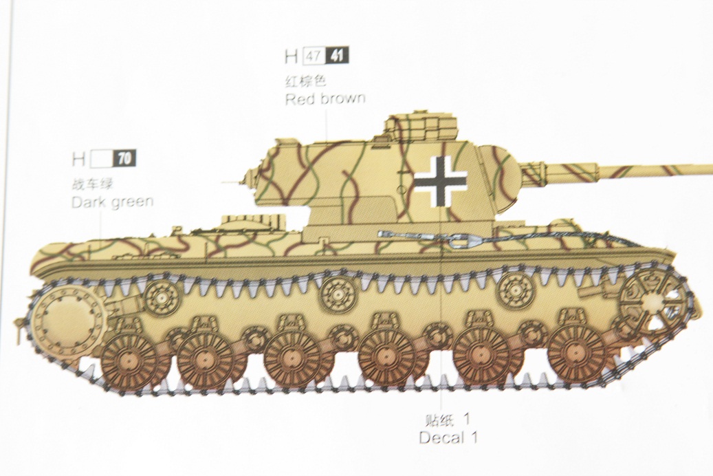 Инструкция как всегда выполнена в виде гармошки, но всё довольно понятно изложено, ещё есть листок по окраске модели и тут трубач предлагает нам покрасит данный танк в трехцветный камуфляж, но если верит архивным фото это ошибочно! На этой машине камуфляжа не было…