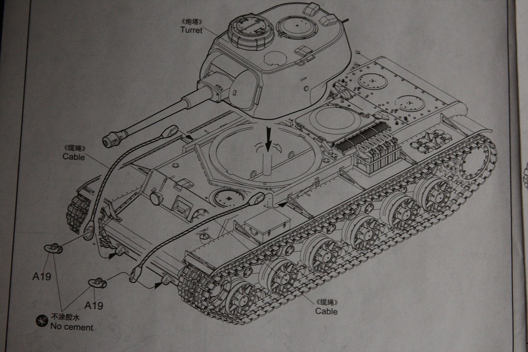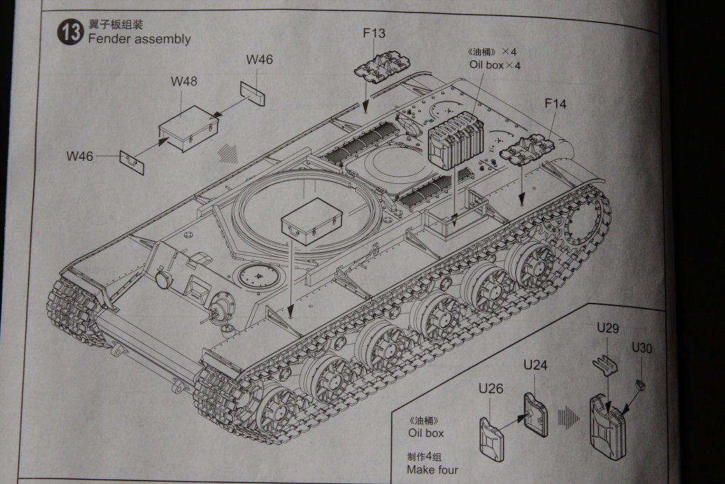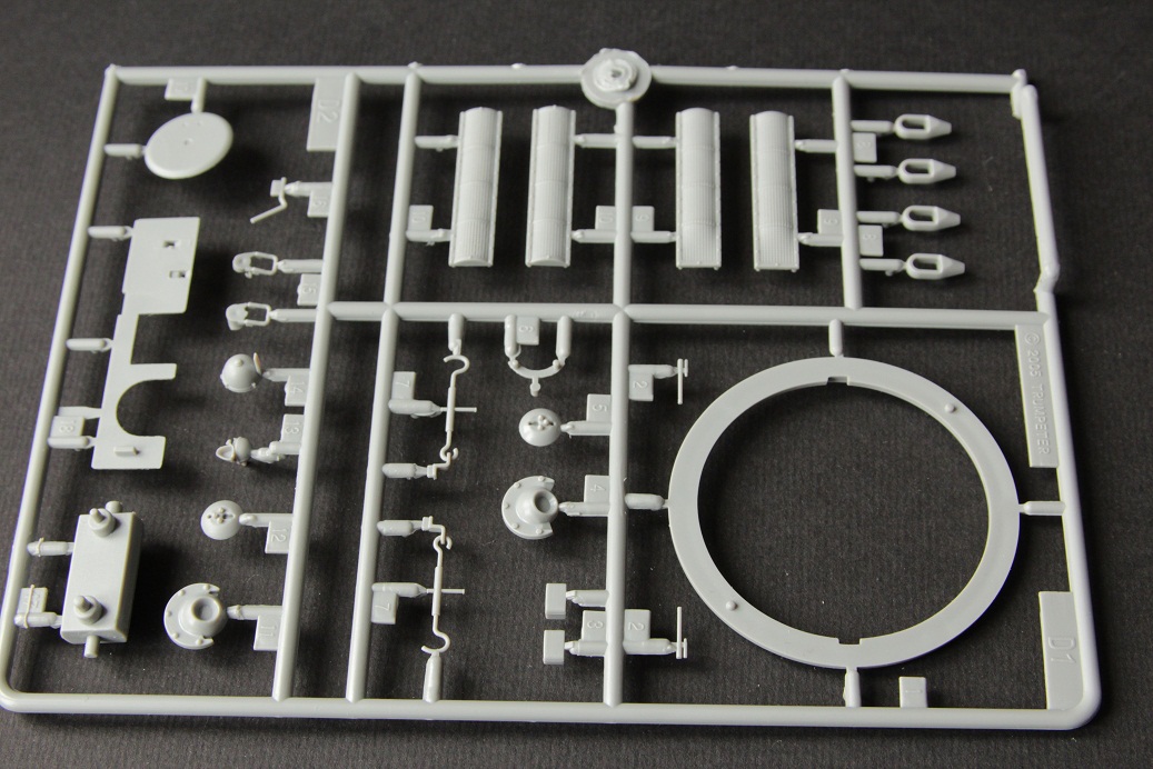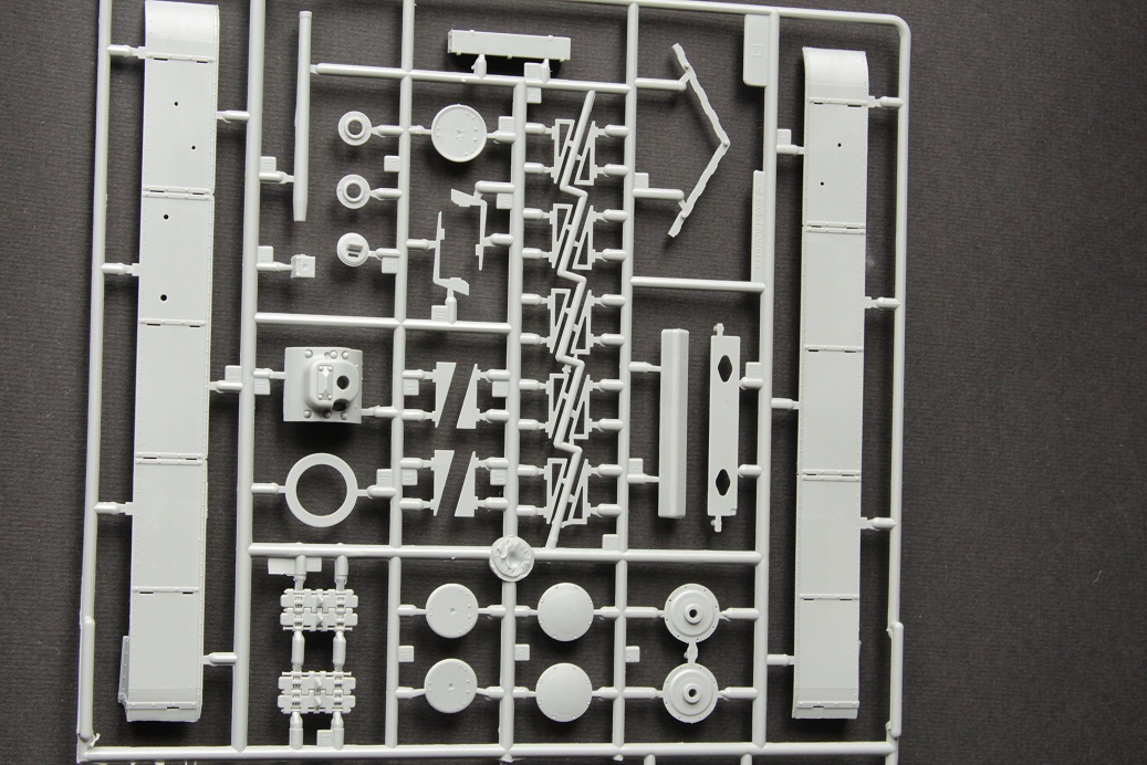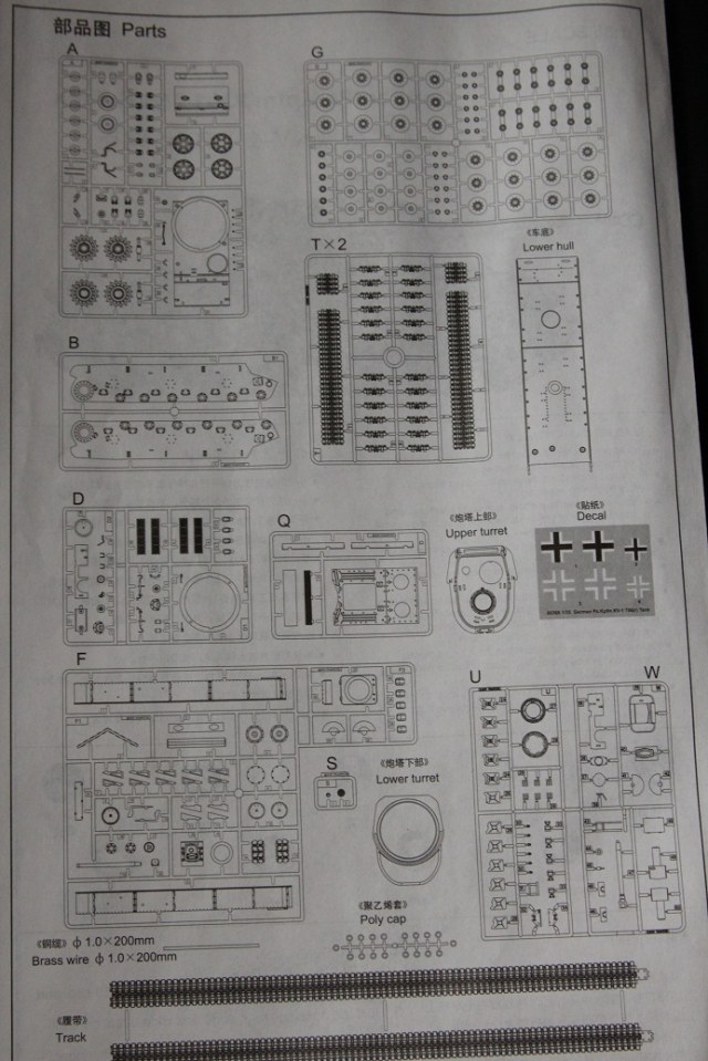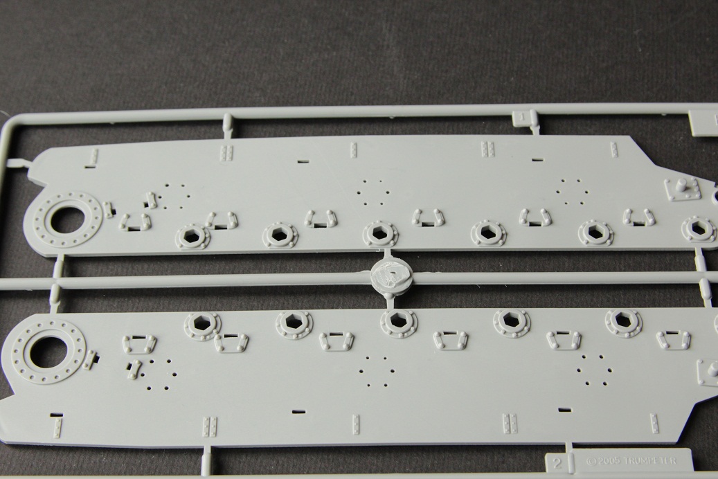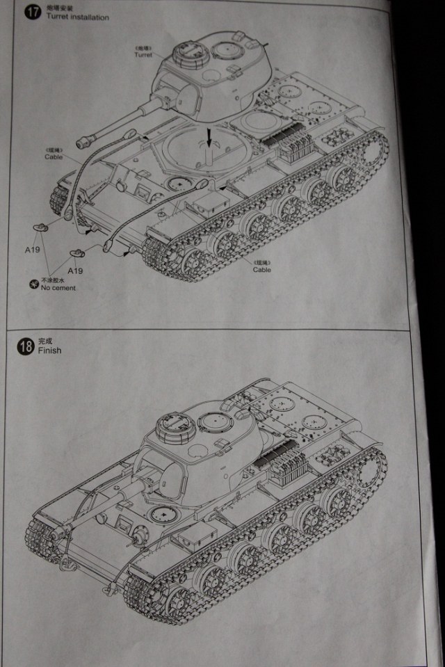 Модель довольно редкая охотился за ней почти полтора года. В коробке лежит 9 литников серого пластика довольно хорошего качества, два варианта траков полу наборные из секций и винил (не самый плохой, но ставить я его не рекомендую, лучше сразу в помойку) но на пластиковых траках огромное количество толкателей и это очень сильно удручает лучше конечно траки заменить на фриул. Корпус и башня идут отдельно есть ещё кусочек медного троса и остекления фар. При детальном осмотре башни оказалось, что стыкуемость её не самая хорошая и наверно придётся шпаклевать, да и сварка на башне совсем замыленная. При осмотре содержимого коробки заметил одно отличие от предыдущих наборов КВ это резиновые прокладки для катков т.е предполагается , что катки должны крутится, ещё понравилось качество канистр предлагаемых трубачём они вроде даже лучше чем у тамии. В общем, набор достаточно хороший, если не считать облоя на некоторых деталях и ужасного толкателя на дульном тормозе (а вообще ствол желательно заменить), но конечно не помешает в дополнение набор травления на эту машину от фирмы Voyagermodel обзор на этот набор можно посмотреть тут http://karopka.ru/community/user/8433/?MODEL=267322
