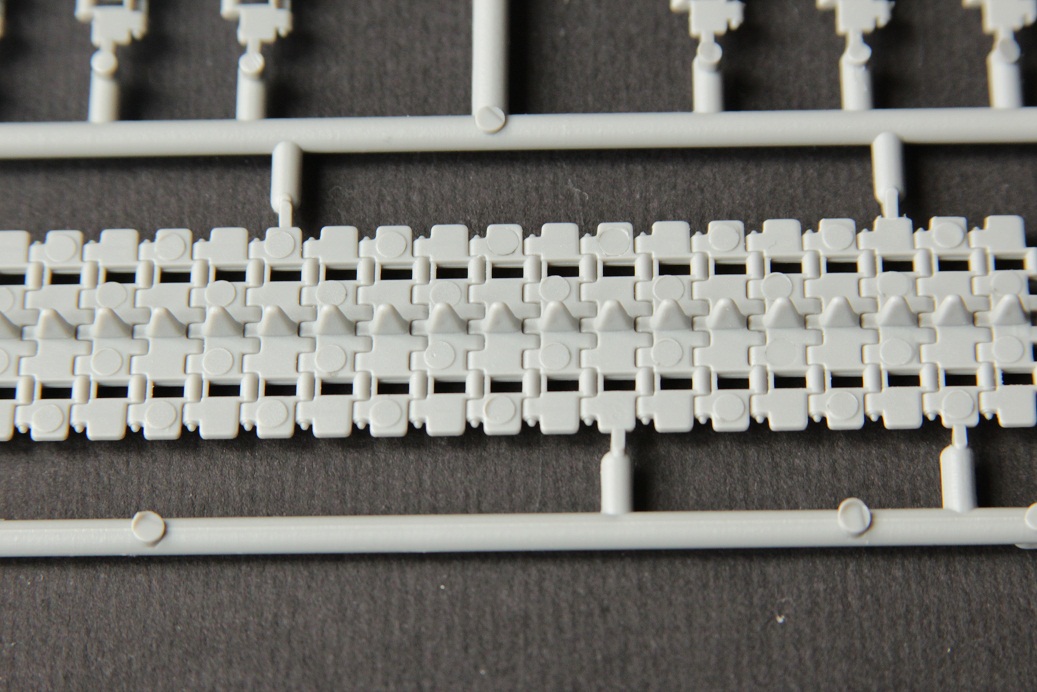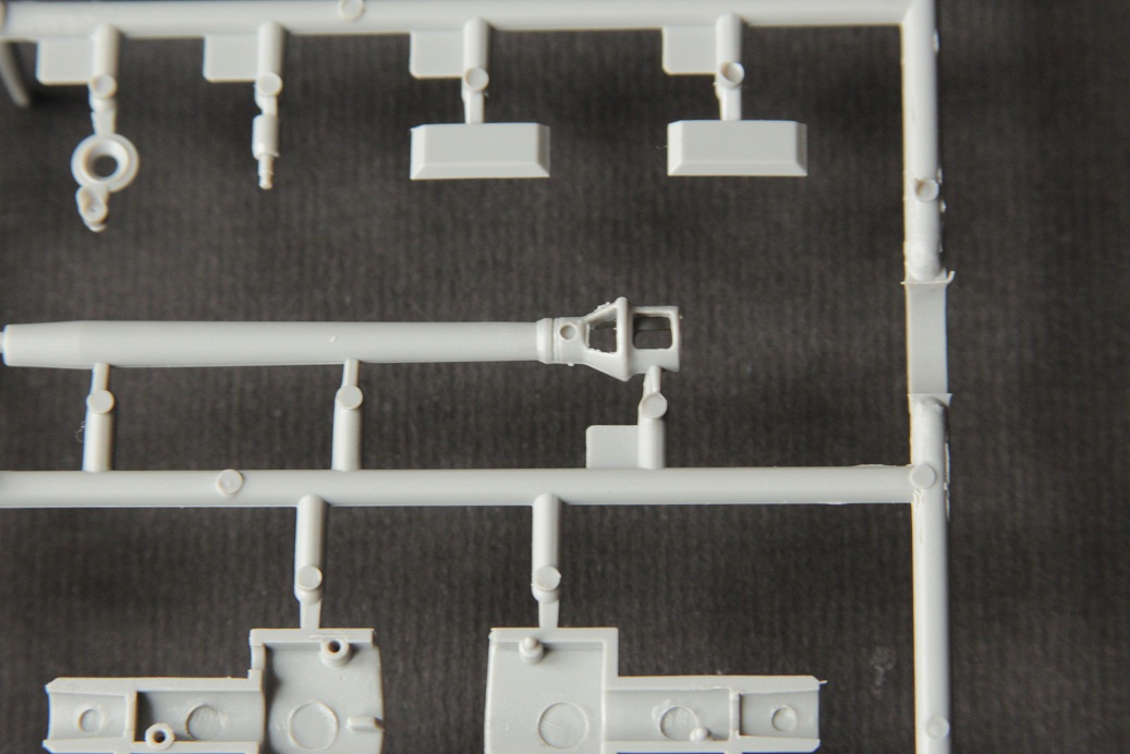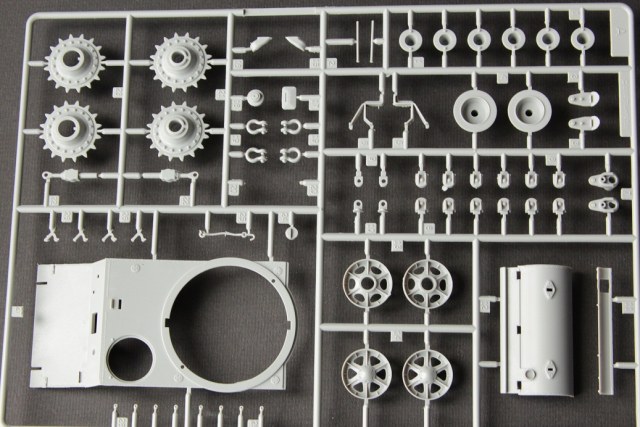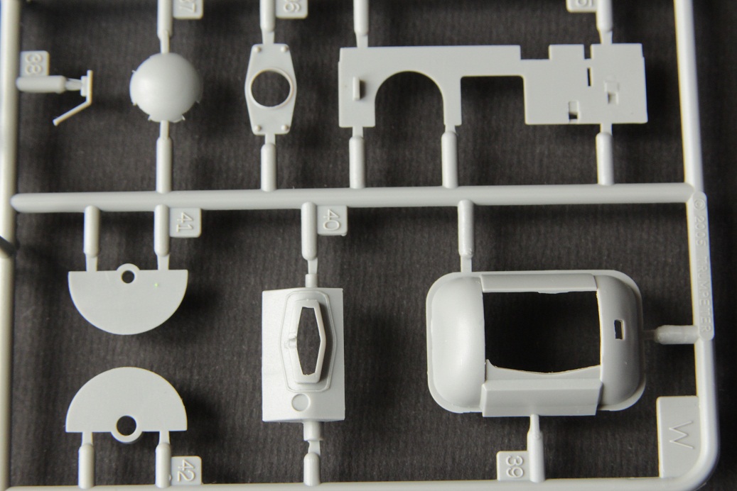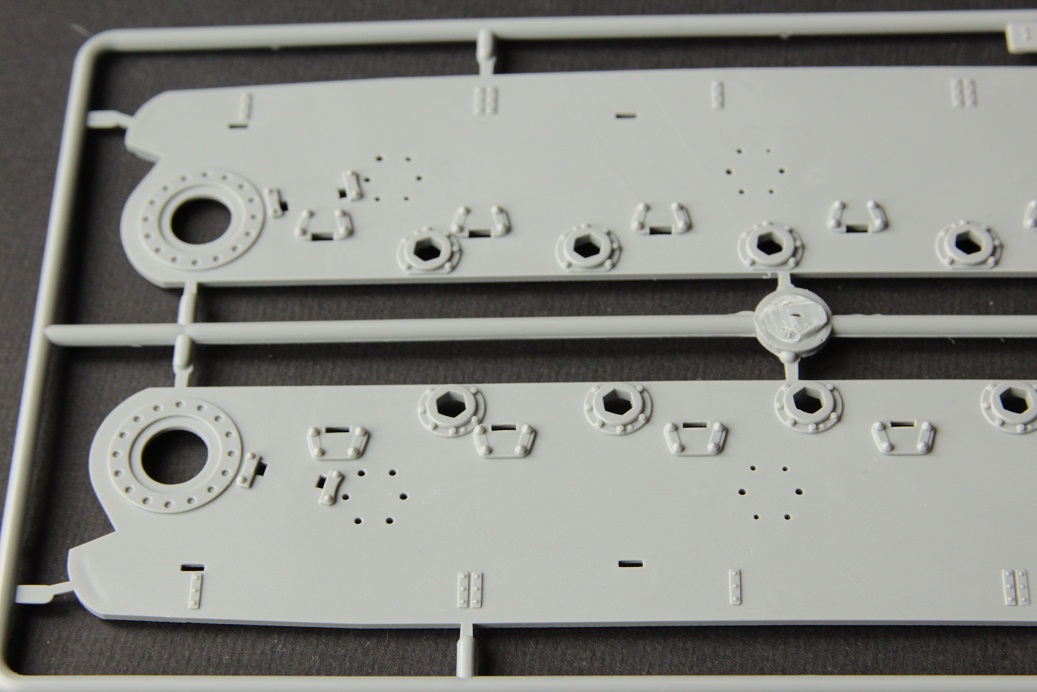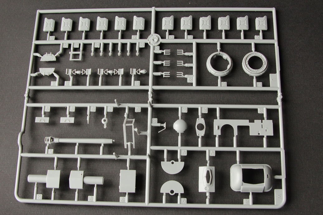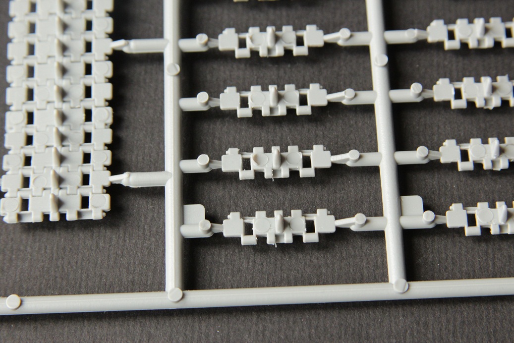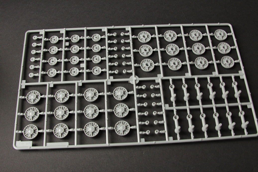 Модель довольно редкая охотился за ней почти полтора года. В коробке лежит 9 литников серого пластика довольно хорошего качества, два варианта траков полу наборные из секций и винил (не самый плохой, но ставить я его не рекомендую, лучше сразу в помойку) но на пластиковых траках огромное количество толкателей и это очень сильно удручает лучше конечно траки заменить на фриул. Корпус и башня идут отдельно есть ещё кусочек медного троса и остекления фар. При детальном осмотре башни оказалось, что стыкуемость её не самая хорошая и наверно придётся шпаклевать, да и сварка на башне совсем замыленная. При осмотре содержимого коробки заметил одно отличие от предыдущих наборов КВ это резиновые прокладки для катков т.е предполагается , что катки должны крутится, ещё понравилось качество канистр предлагаемых трубачём они вроде даже лучше чем у тамии. В общем, набор достаточно хороший, если не считать облоя на некоторых деталях и ужасного толкателя на дульном тормозе (а вообще ствол желательно заменить), но конечно не помешает в дополнение набор травления на эту машину от фирмы Voyagermodel обзор на этот набор можно посмотреть тут http://karopka.ru/community/user/8433/?MODEL=267322