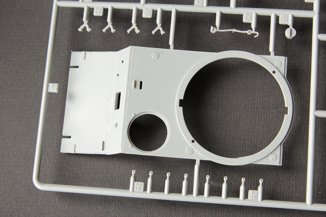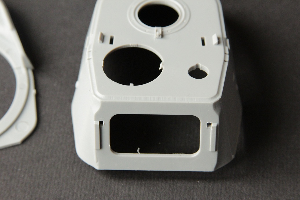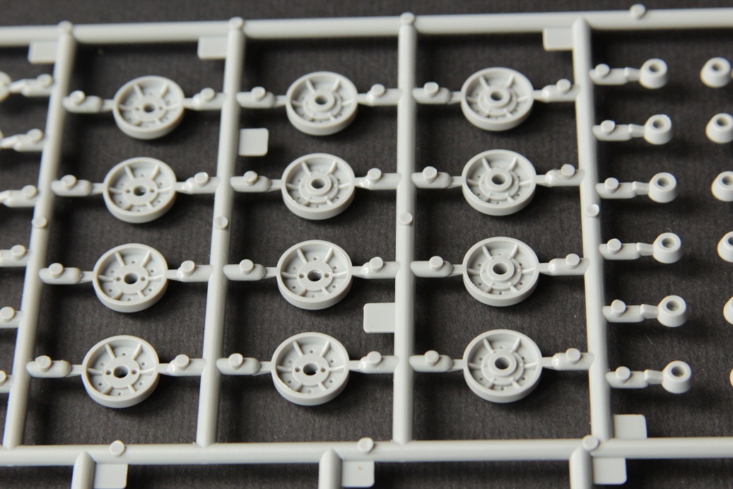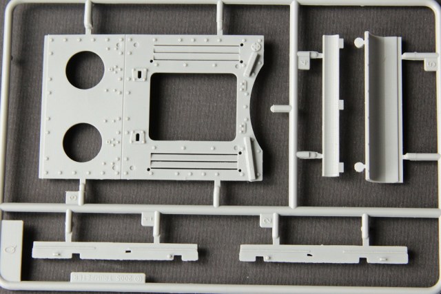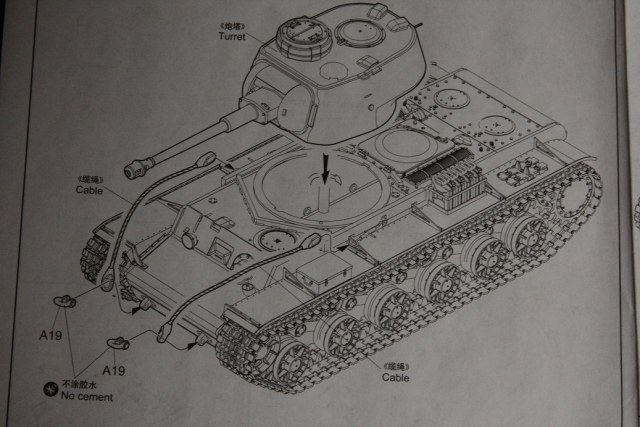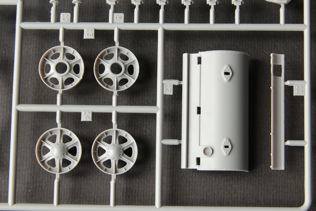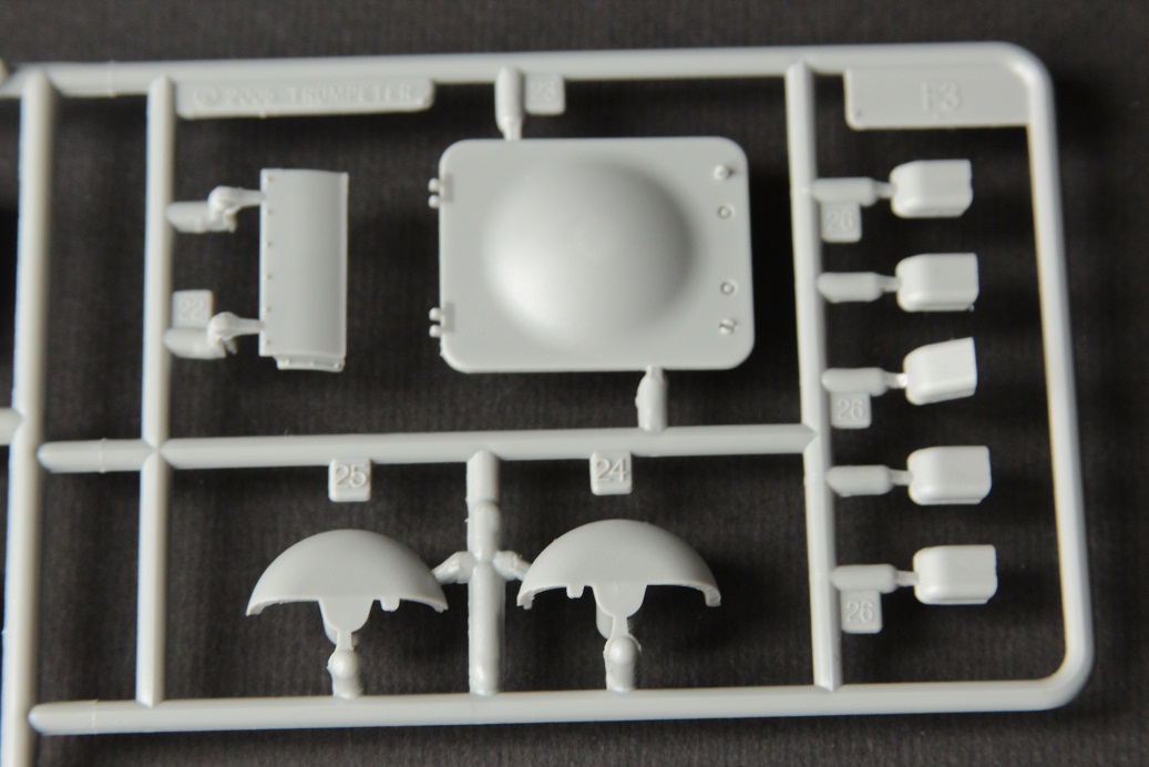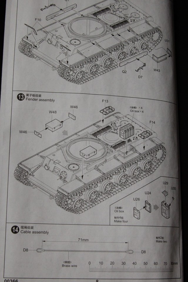 Модель довольно редкая охотился за ней почти полтора года. В коробке лежит 9 литников серого пластика довольно хорошего качества, два варианта траков полу наборные из секций и винил (не самый плохой, но ставить я его не рекомендую, лучше сразу в помойку) но на пластиковых траках огромное количество толкателей и это очень сильно удручает лучше конечно траки заменить на фриул. Корпус и башня идут отдельно есть ещё кусочек медного троса и остекления фар. При детальном осмотре башни оказалось, что стыкуемость её не самая хорошая и наверно придётся шпаклевать, да и сварка на башне совсем замыленная. При осмотре содержимого коробки заметил одно отличие от предыдущих наборов КВ это резиновые прокладки для катков т.е предполагается , что катки должны крутится, ещё понравилось качество канистр предлагаемых трубачём они вроде даже лучше чем у тамии. В общем, набор достаточно хороший, если не считать облоя на некоторых деталях и ужасного толкателя на дульном тормозе (а вообще ствол желательно заменить), но конечно не помешает в дополнение набор травления на эту машину от фирмы Voyagermodel обзор на этот набор можно посмотреть тут http://karopka.ru/community/user/8433/?MODEL=267322