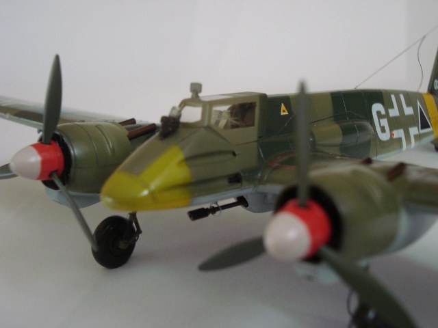 По самой модели: Собиралась и красилась «запоем» во все свободное время (что-то около 2-х недель). Хотя сама по себе модель очень неплоха, решился на некоторые доработки: немного повозился в кабине, добавил стеклянный прицел, нарезал углы пикирования на остеклении, немного доработал 30-мм МК-103, проковырял отверствие в ней, сделал проводку на шасси (там же попытался сымитировать разлезлость оплетки проводки, возможно зря так как не до конца уверен в материале изоляции), прорезал отверствия и установил фюзеляжные 20-мм пушки, соорудил и прицепил антенну из колготок, рассверлил патрубки (правда все равно не видно), сделал посадочную фару из литника, из иглы от шприца и проволоки сколотил трубку, немного добавил проволочки на двигатель.