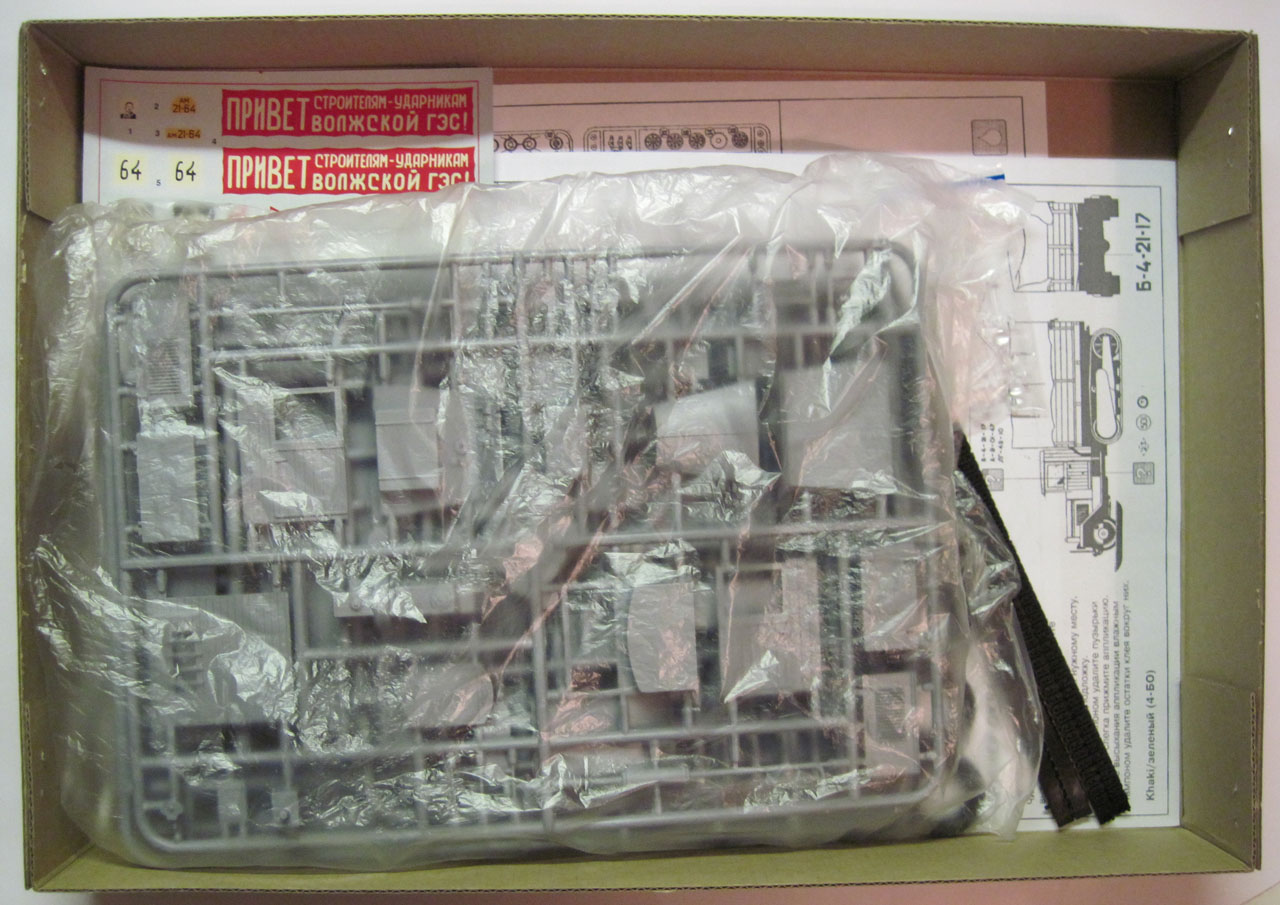 Модель упакована в стандартную для ВЭ коробку из тонкого картона. Внутри находятся 5 литников из светло-серого пластика, пакетик с прозрачными деталями для остекления кабины и фар, две гусеничные ленты из резиноподобного материала, три покрышки из пластика черного цвета, декаль и инструкция на двух листах формата А4 (занимает только три страницы из четырех возможных, по виду – банальная ксерокопия).