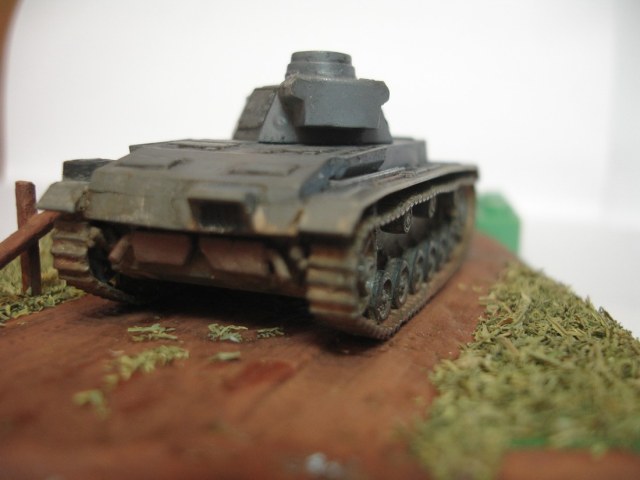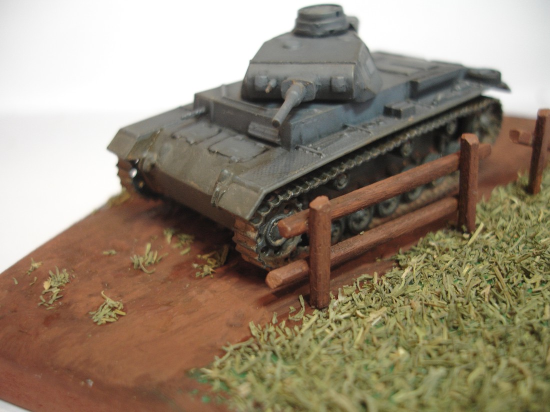 Вот выставляю свой PzIII c некоторыми дополнениями и маленькой диорамкой.За основу взял кусок ламината,потом залил гипсовой шпаклёвкой.Красил гуашью,трава-сушёный укроп.Забор сделал из зубочисток.Приятного просмотра!