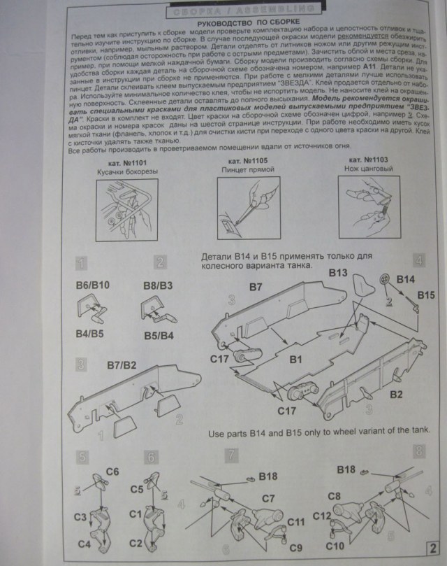 Модель упакована в среднего размера коробку из тонкого картона. Внутри находятся 4 литника с деталями модели танка из характерного для "Звезды" зеленого пластика, 1 литник из черного пластика с деталями для гусеничных лент (имитация провиса отсутствует напрочь, альтернативы в виде виниловых гусениц не предусмотрено), декаль, нейлоновая сеточка для воспроизведения системы охлаждения, литник из зеленого пластика с деталями для сборки 4 фигурок танкистов и 6-ти страничная инструкция.