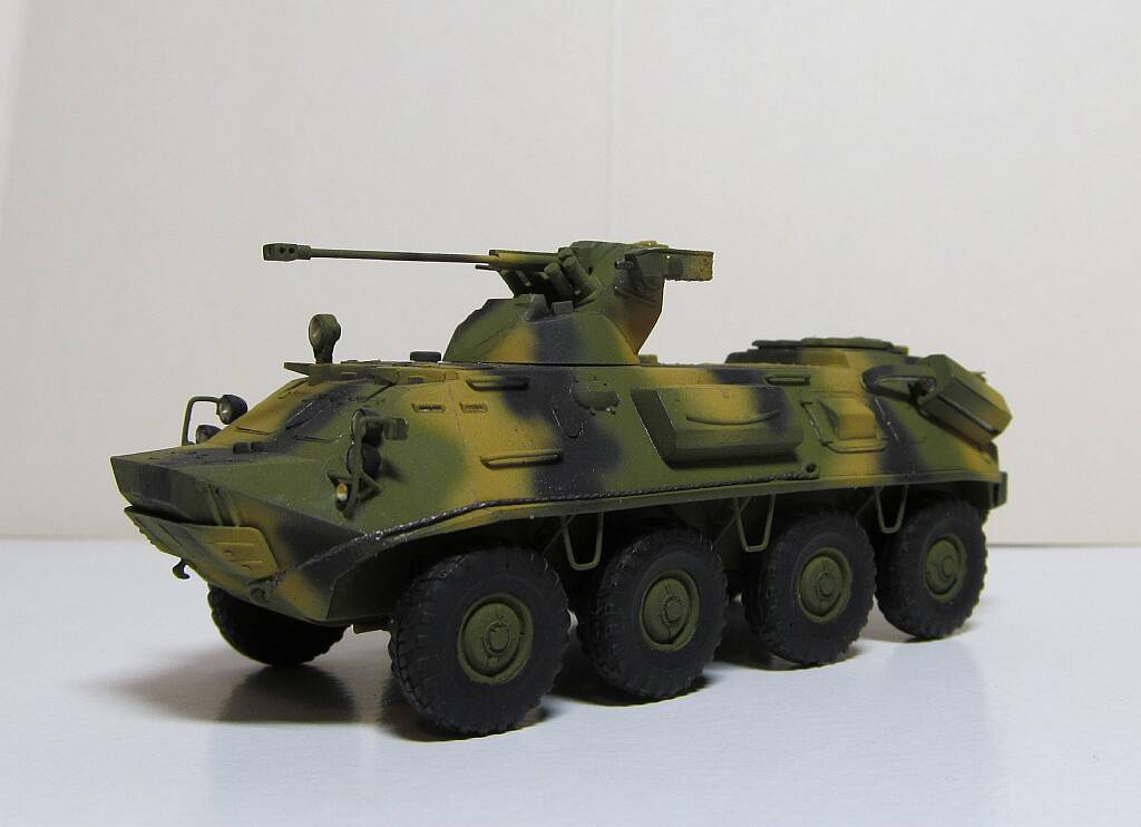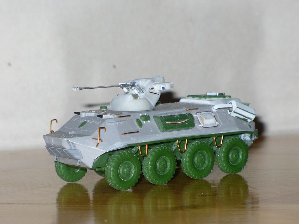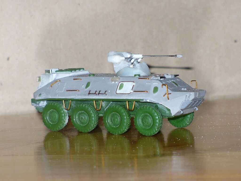 Боевой модуль от БТР-80А можно было взять из набора МТ-ЛБМ, от «АСЕ», или «Водника», фирмы «Грань». Умные люди советовали «АСЮ», но в магазине, по закону подлости, была только «Грань», а творческий зуд в руках не позволял долго ждать. Пришлось брать то, что есть и долго делать из него то, что нужно: подгонять и шпаклевать детали корпуса башни, переделывать пушку и пулемётный контейнер, заново делать дымовые гранатомёты и контейнер АГСа.